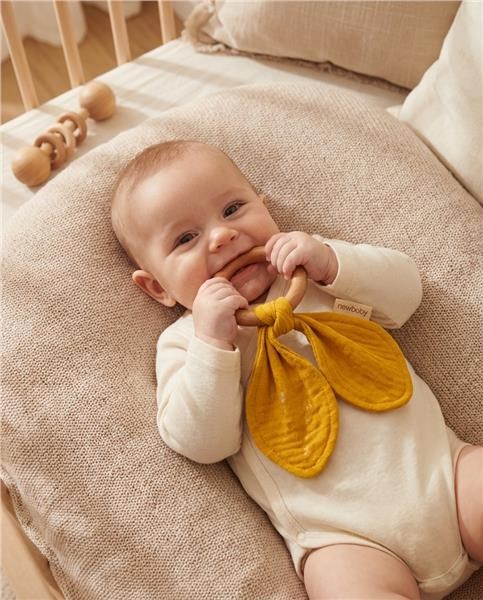 Kousátko s mušelínovou plenou je ideální sada, když se dítěti prořezávají zoubky. Kousátko je vyrobeno z bukového dřeva šetrného ke středu a měkké mušelínové látky. Zcela bezpečné pro děti přináší uklidňující úlevu při prořezávání zoubků. Kousátko lze použít také jako hračku pro miminka. Kousátko se dokonale hodí k našim dalším mušelínovým výrobkům a vytváří tak krásnou sadu, kterou lze darovat na dětskou oslavu.