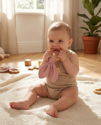 Kousátko s mušelínovou plenou je ideální sada, když se dítěti prořezávají zoubky. Kousátko je vyrobeno z bukového dřeva šetrného ke středu a měkké mušelínové látky. Zcela bezpečné pro děti přináší uklidňující úlevu při prořezávání zoubků. Kousátko lze použít také jako hračku pro miminka. Kousátko se dokonale hodí k našim dalším mušelínovým výrobkům a vytváří tak krásnou sadu, kterou lze darovat na dětskou oslavu.
