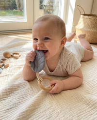 Kousátko s mušelínovou plenou je ideální sada, když se dítěti prořezávají zoubky. Kousátko je vyrobeno z bukového dřeva šetrného ke středu a měkké mušelínové látky. Zcela bezpečné pro děti přináší uklidňující úlevu při prořezávání zoubků. Kousátko lze použít také jako hračku pro miminka. Kousátko se dokonale hodí k našim dalším mušelínovým výrobkům a vytváří tak krásnou sadu, kterou lze darovat na dětskou oslavu.