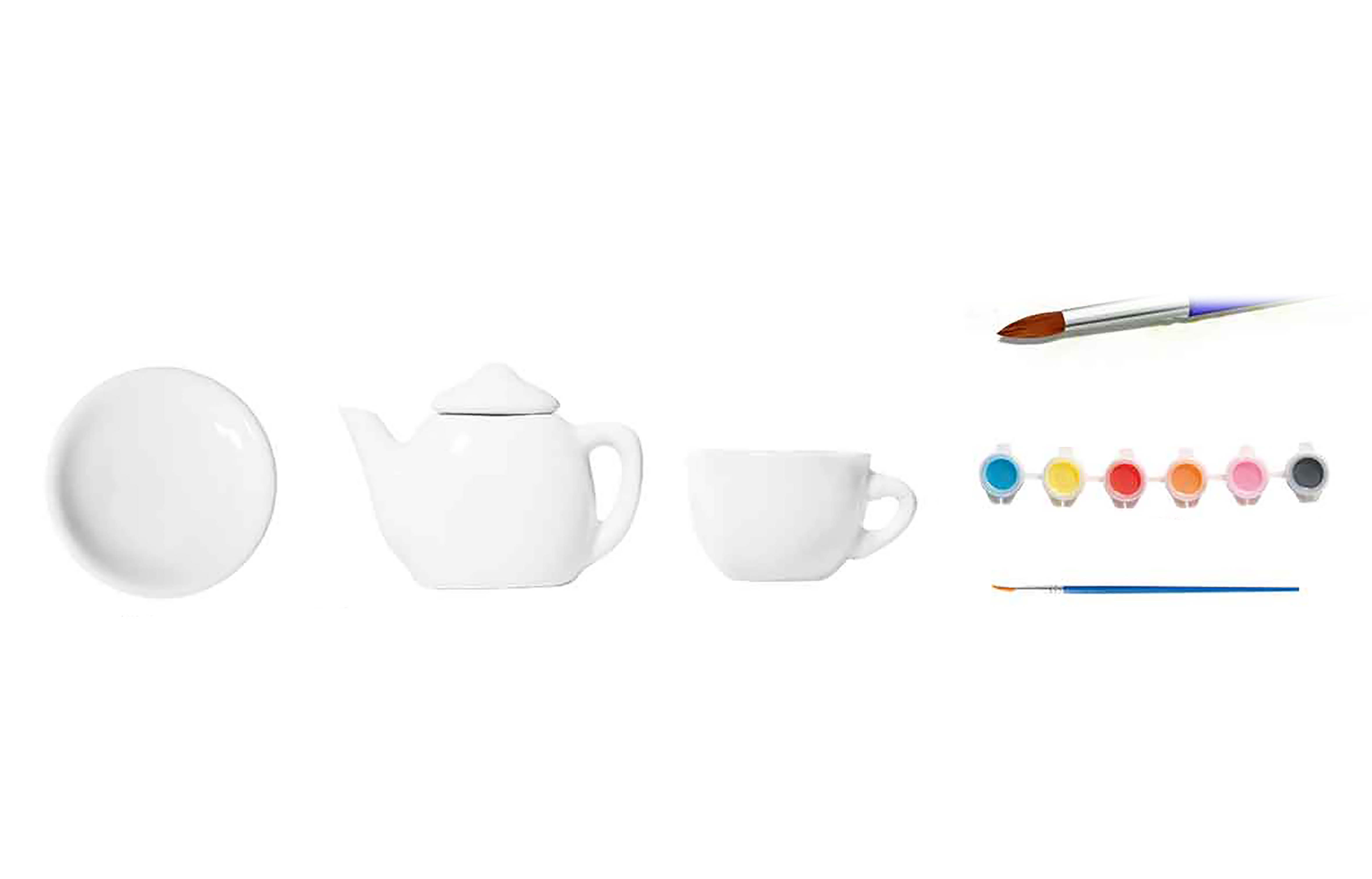 Kreativní set malované nádobí. Velikost konvičky 7 cm, velikost hrnečku 4 cm. Obsahuje konvičku s pokličkou, 2 hrnečky a 2 podšálky., sadu 6 barev, štětec.