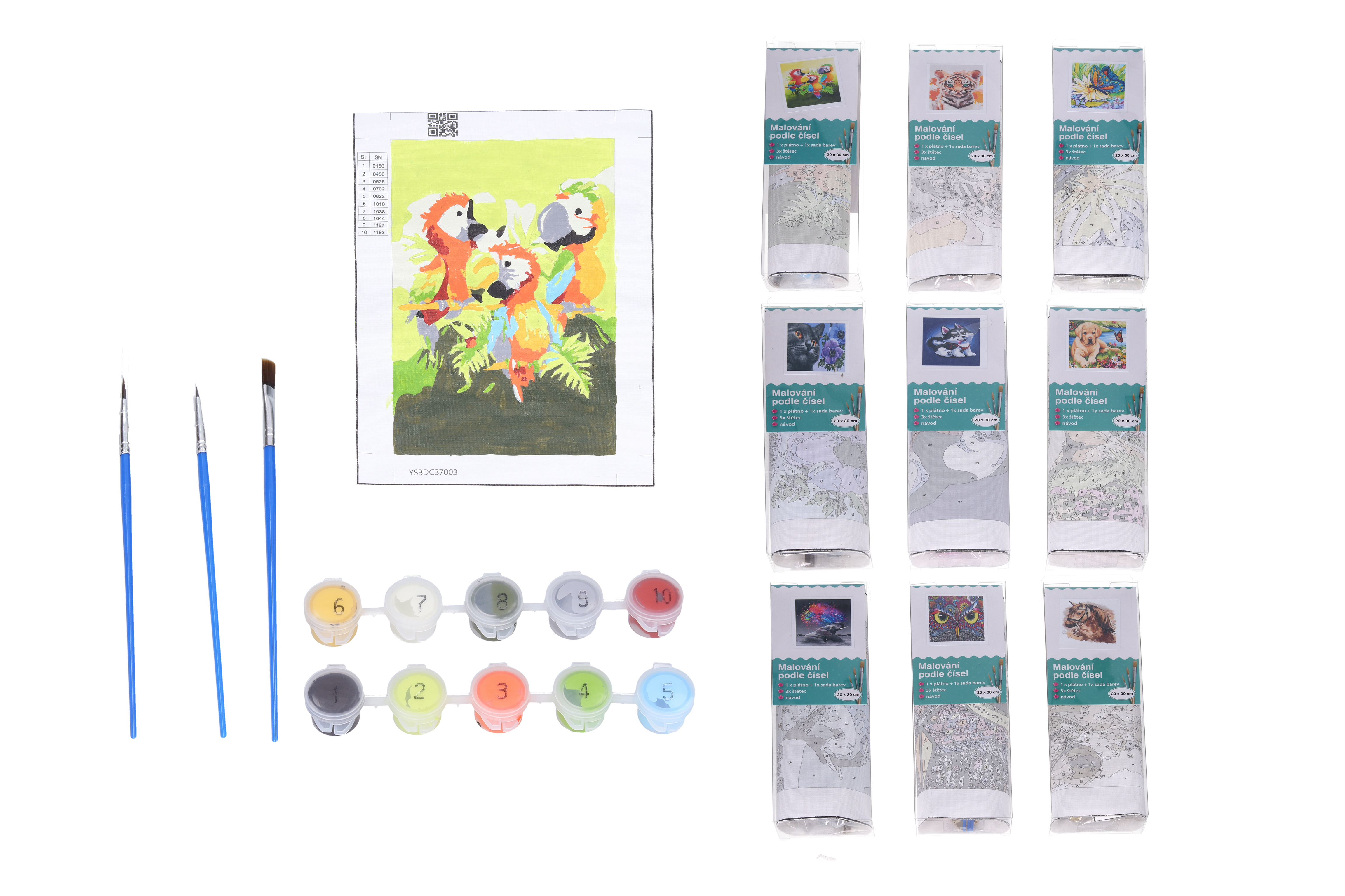Uvnitř balení: 1x plátno, 1x sada barev, 3x štětec, návod.