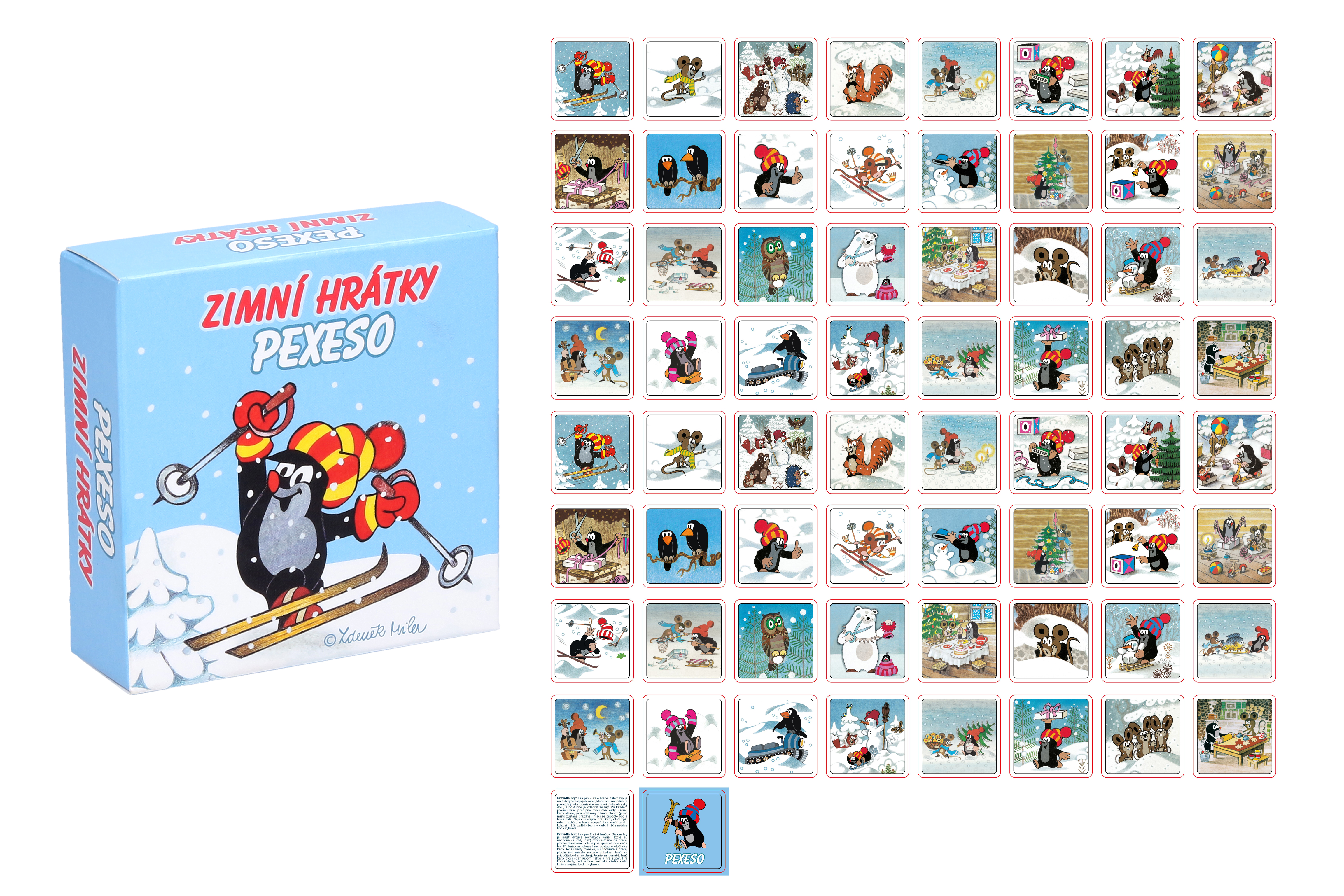 Krtek Pexeso v krabičce zimní hrátky. 64 kartiček, 32 párů. Rozměr kartiček 63x63mm. Papír 350g.
