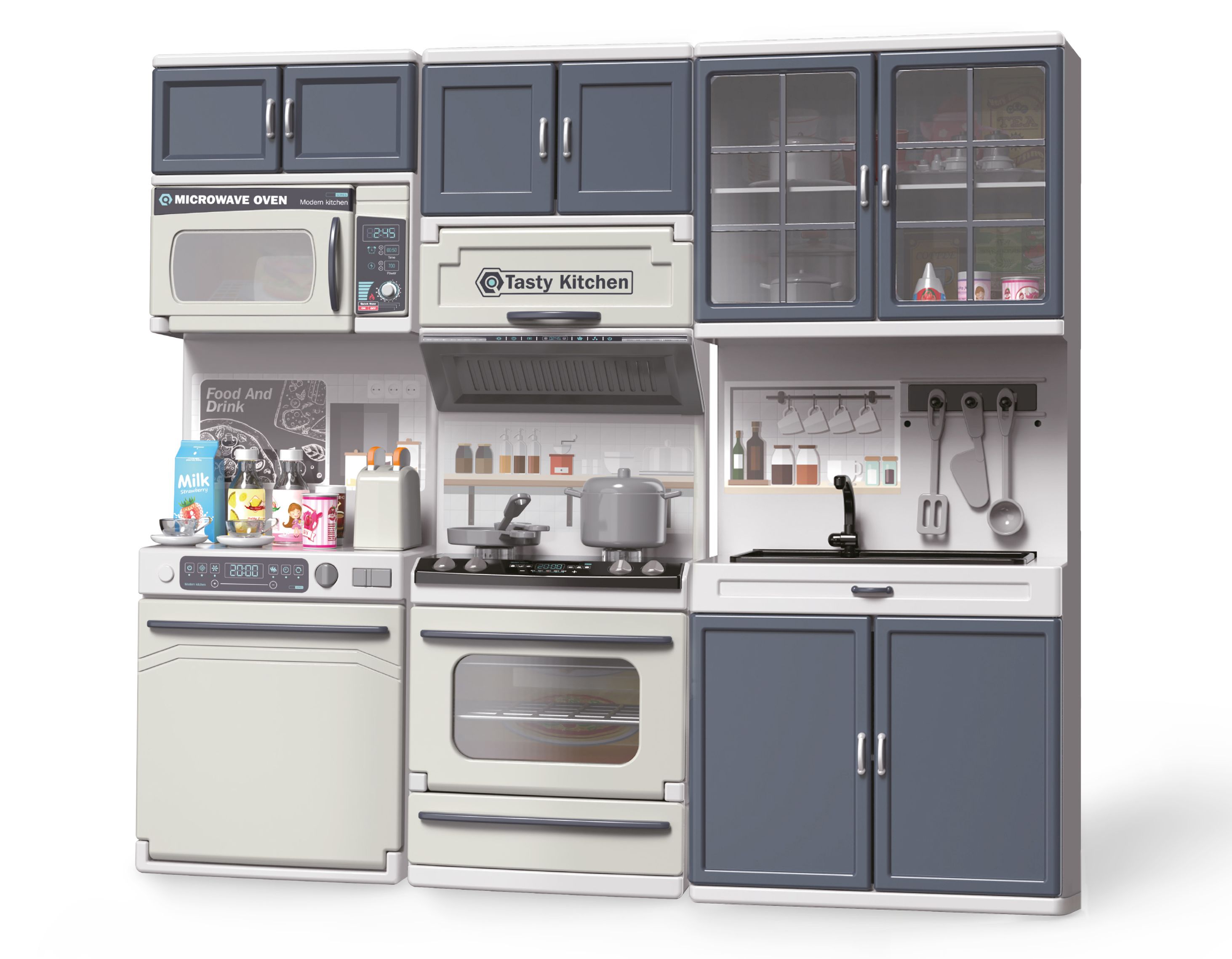 Kuchyňka s efekty. Rozměry 34x7x30 cm. Světelné a zvukové efekty tlačítkem na sporáku. 3xAG13 baterie do sporáku součástí. Obsah - trouba se sporákem, odpařovač, myčka, mikrovlnka, dřez, skříňky, topinkovač, nádobí, jídlo, nápoje.
