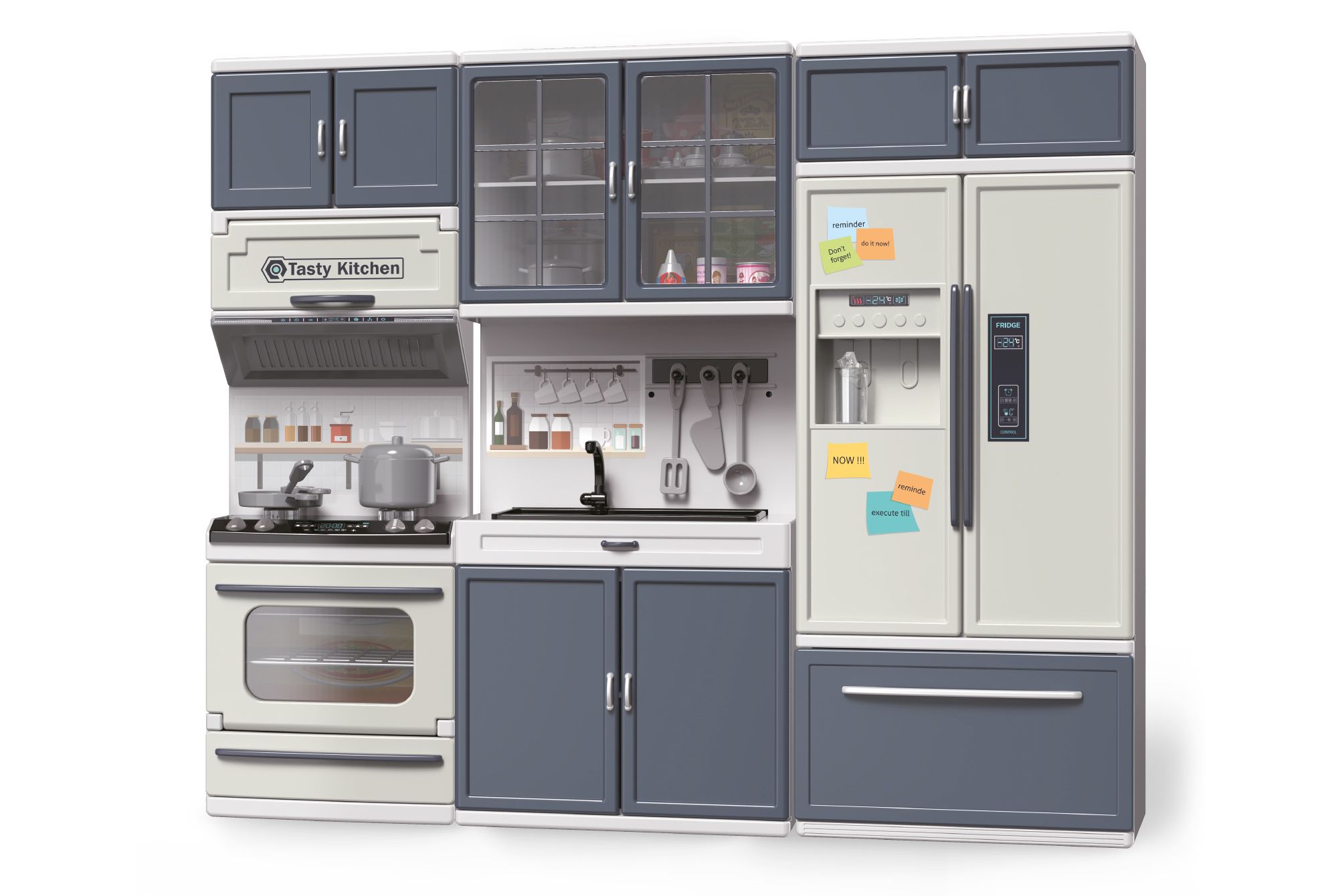 Kuchyňka s efekty. Rozměry 36x7x30 cm. Světelné a zvukové efekty tlačítkem na sporáku. 3xAG13 baterie do sporáku součástí. Obsah - trouba se sporákem, odpařovač, dřez, lednice, skříňky, nádobí, jídlo.
