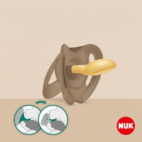 Dojenček sesek NUK For Nature iz naravne gume 2/škatlica 0-6 mesecev. Ti seski NUK so izdelani iz naravnega lateksa in popolnoma proizvedeni v Nemčiji. Seveda ne vsebujejo BPA in ustrezajo evropskemu varnostnemu standardu EN1400. NUK For Nature je sestavljen iz naravnih surovin najmanj 98 %. Trde dele izdelujemo iz trajnostnih plastik. Naravni izvor je neodvisno certificiran. Mehka cucla je izdelana iz čiste naravne gume. Obnovljiva surovina 100 % rastlinskega izvora je zelo mehka, topla in izjemno prožna. Originalna oblika NUK je prav tako navdihnjena z naravo - zgoraj okrogla, spodaj ravna. Cucla NUK For Nature se zato enostavno pritisne na ustnice in pušča dovolj prostora za jezik. Brez BPA, 2 kosa v pakiranju, pakirano le v papirju - embalaža se lahko zavrže v ločen odpad. Lateksne cuclje je treba menjati vsake 1-2 mesece ali najkasneje, ko se začnejo lepit.