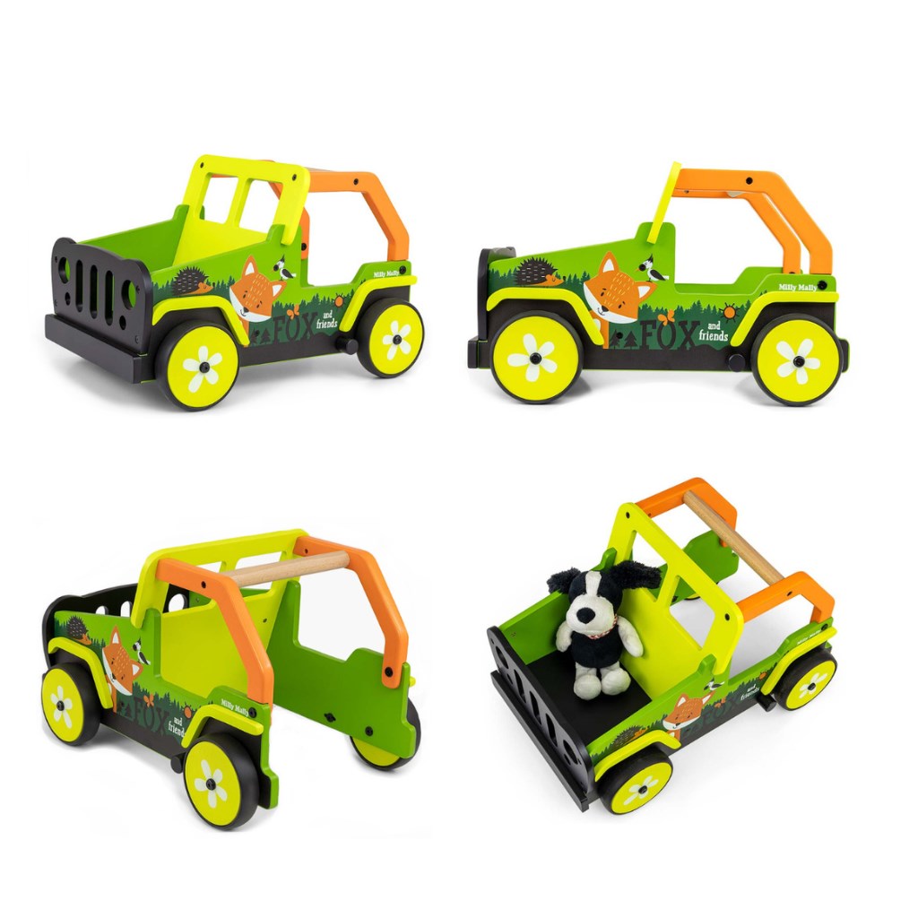 Ta otroški hodilnik, navdihnjen z legendarnimi terenskimi avtomobili, je izdelan iz visokokakovostnega lesa in okolju prijaznih materialov. Kolesni pokrovi so narejeni iz mehkega TPR plastike, ki je fleksibilna in odporna ter omogoča uporabo na vseh površinah brez poškodb ali prask. Ne vsebujejo mehčalcev in so prijazni do okolja.