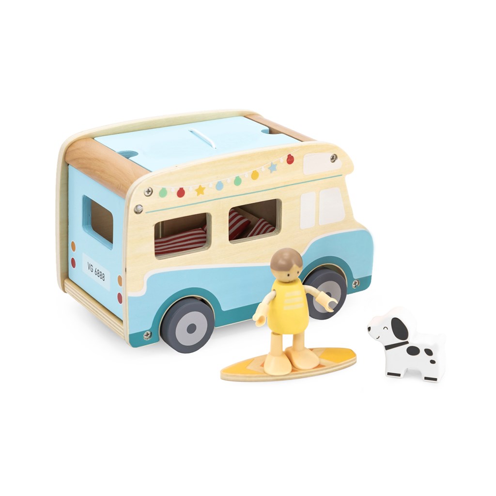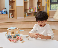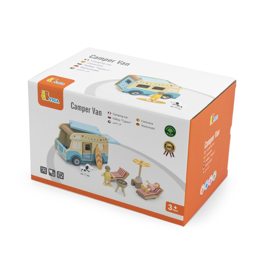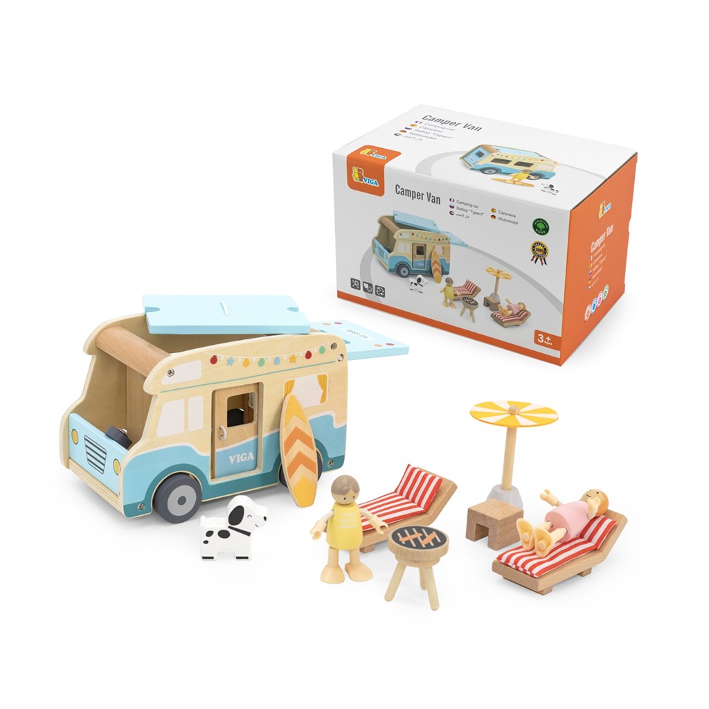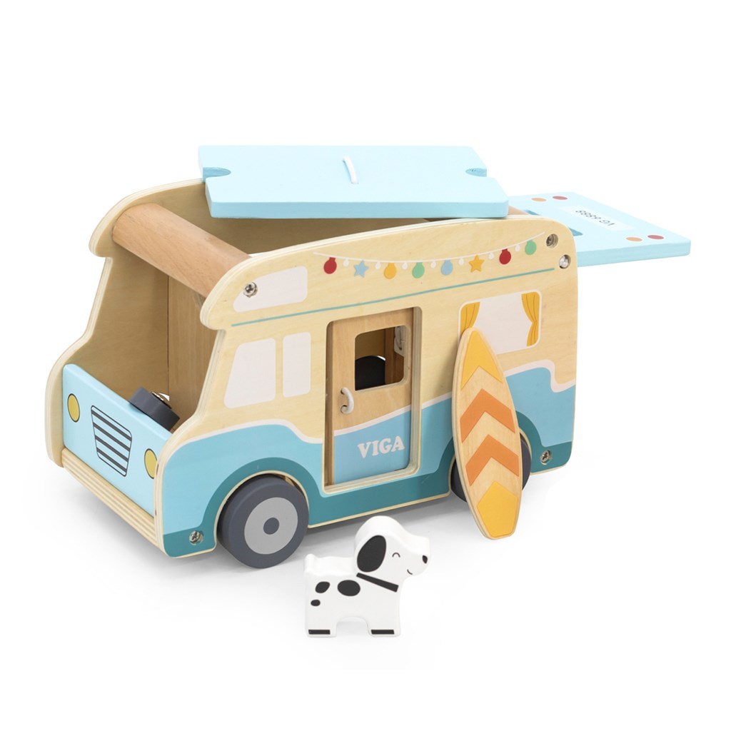 Trdna lesena konstrukcija in nežno izbrane pastelne barve, nanesene z netoksičnimi barvami, naredijo igračo ne le estetsko prijetno, ampak tudi varno za najmlajše. Set je zasnovan z mislijo na razvoj domišljije, ročnih spretnosti in socialnih sposobnosti otrok ter ponuja veliko ur ustvarjalne zabave. Idealna je za otroke, ki obožujejo avanture in sanjajo o lastnem mobilnem domu na kolesih.