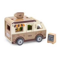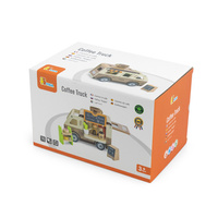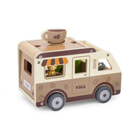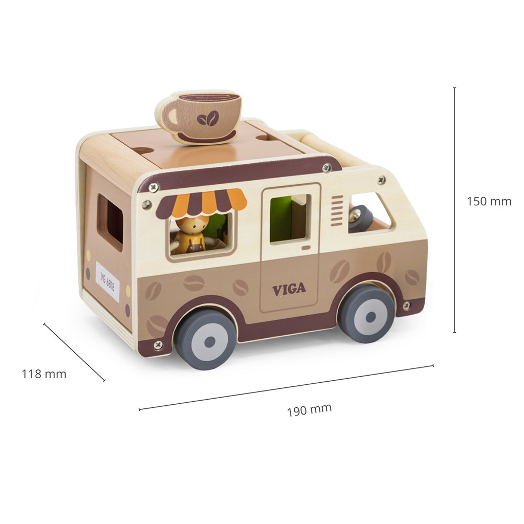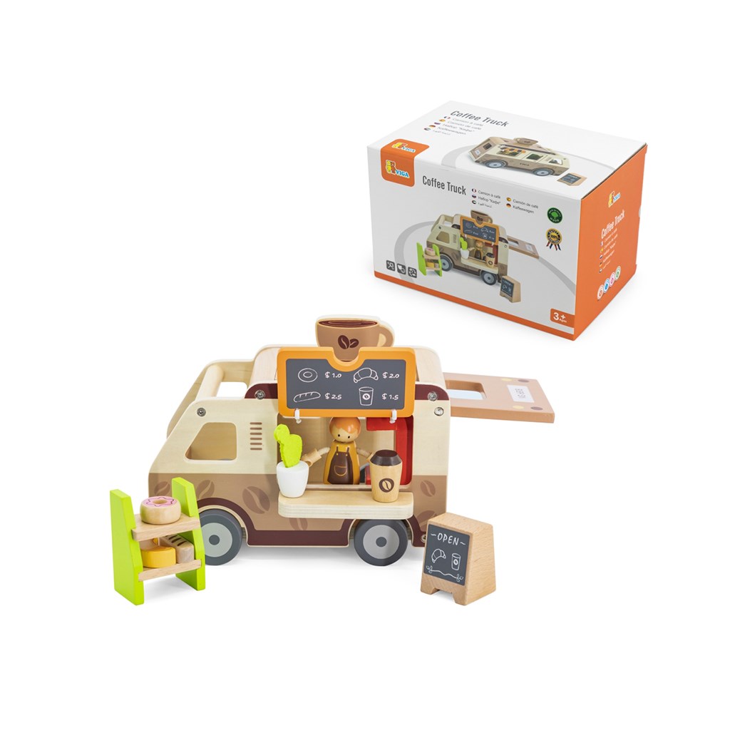 Trdna lesena konstrukcija in nežne pastelne barve, nanešene z netoksičnimi barvami, naredijo igračo ne le estetsko prijetno, temveč tudi varno za najmlajše. Set je zasnovan z mislijo na razvoj domišljije, ročnih spretnosti in socialnih sposobnosti otrok ter ponuja mnogo ur kreativne zabave. Popolno za otroke, ki ljubijo avanture in sanjajo o svoji mobilni kavarnici na kolesih.