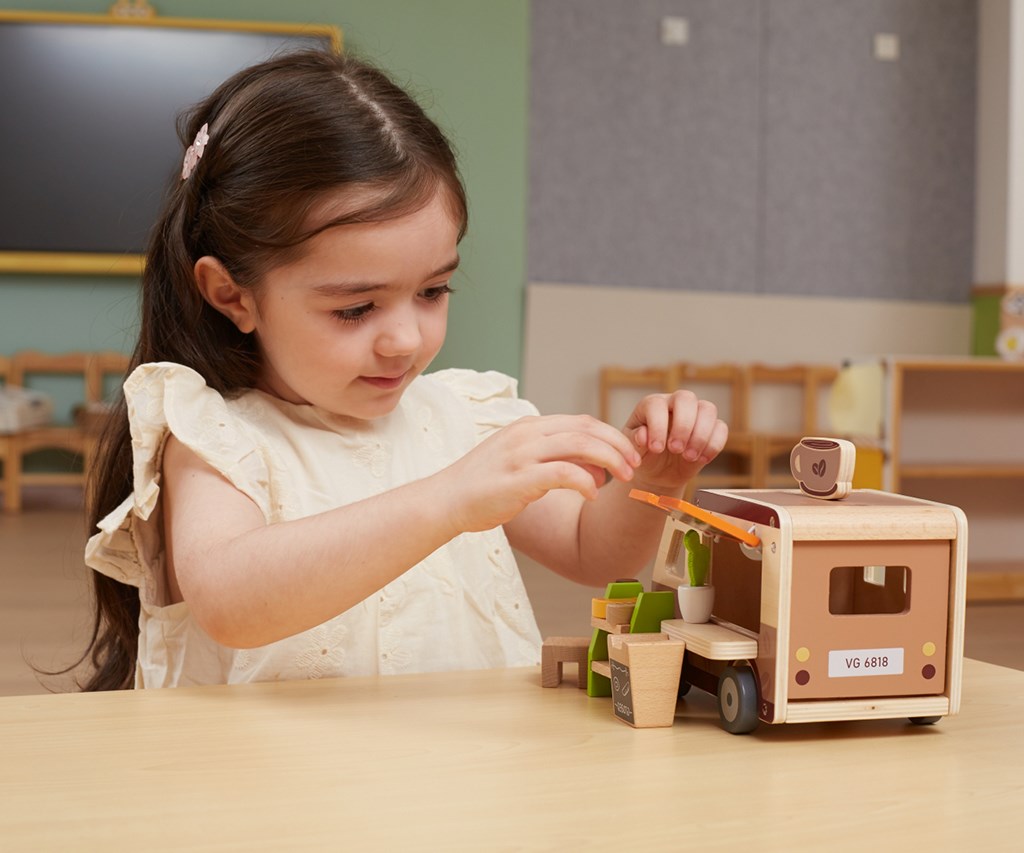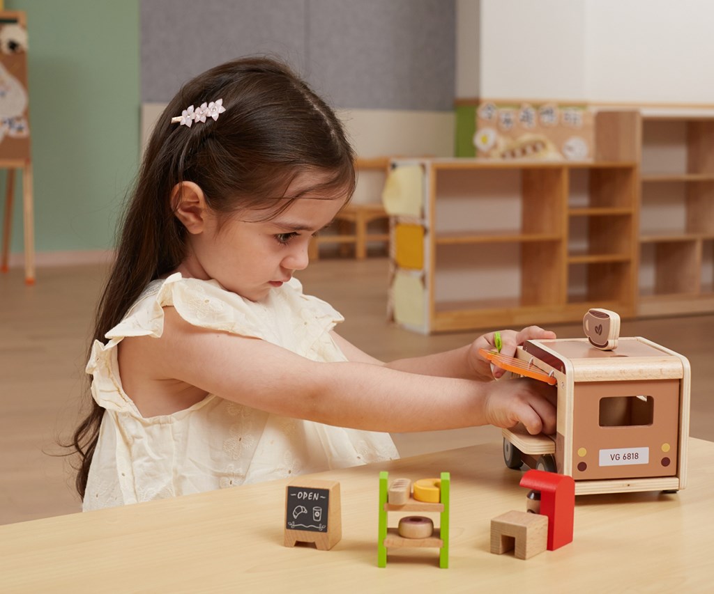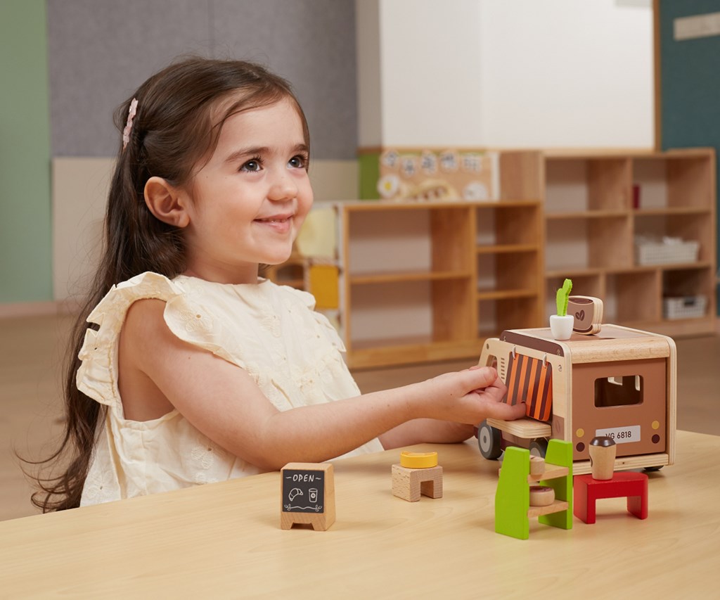 Lesena mobilna kavarnica je izjemno kreativna in skrbno izdelana igrača, ki otroke popelje v fascinanten svet kavarnskih avantur. Zaradi realističnih elementov lahko otroci prevzamejo vlogo barista in strežejo svojim „strankam“, kar igro naredi zelo privlačno. Kavarnica ne le zabava, ampak tudi spodbuja razvoj otroka na več načinov: razvija domišljijo, motoriko in socialne veščine. Igra priprave kave in postrežbe jedi razvija empatijo ter komunikacijske sposobnosti ter uči otroke interakciji v različnih situacijah.