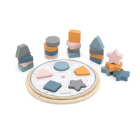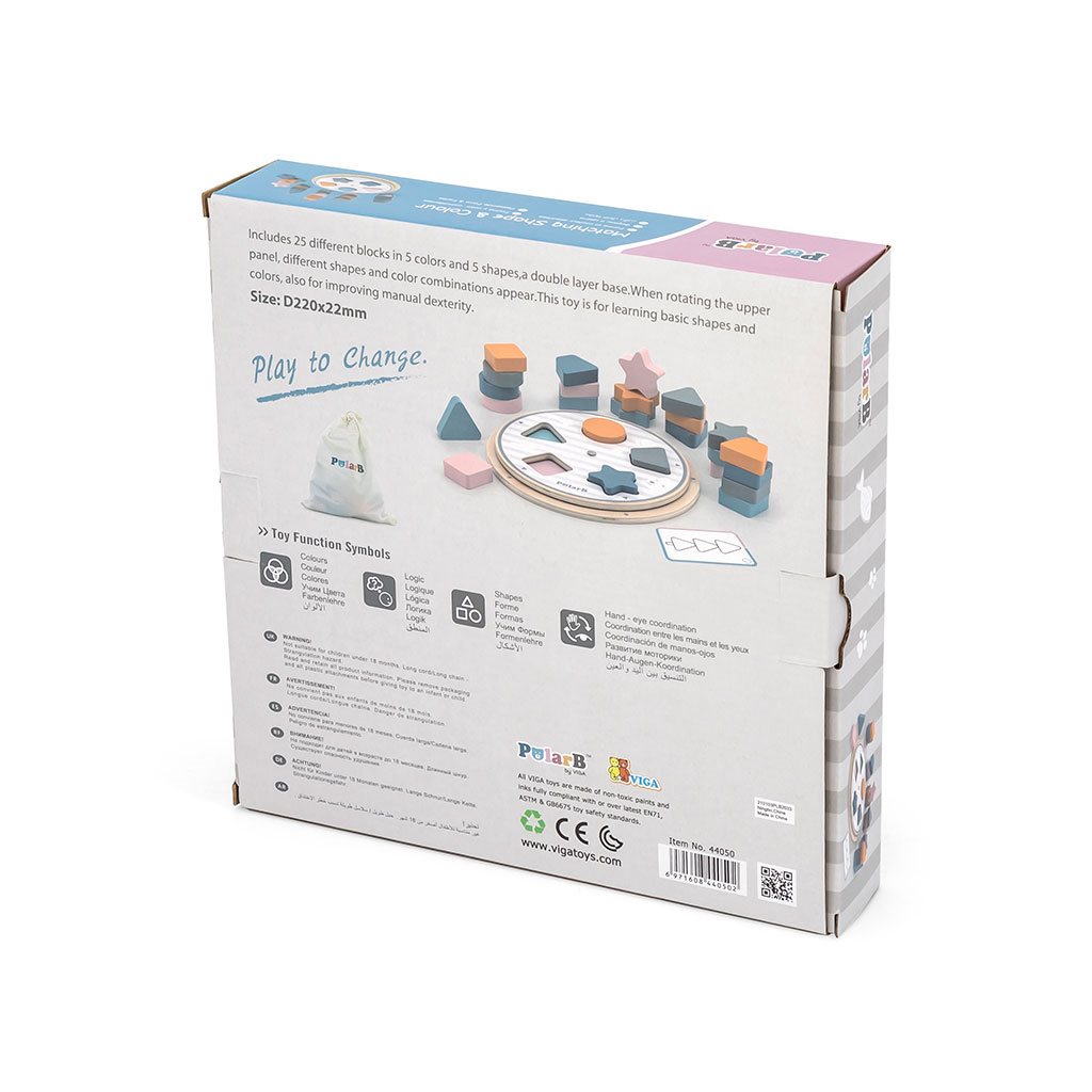 Predstavljamo leseno igračo podjetja VIGA - sestavljanko oblik in barv iz serije POLAR BEAR. Igrača se sestavlja iz premikajočega diska, 25 kock v različnih kombinacijah barv in oblik ter dvoslojnimi karticami z obrázki. Bloke je mogoče postaviti na disk tako, da se ustrezno ujemajo oblike in barve ali na kartice, kjer jih lahko razporedite glede na prikazane slike.