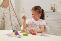 Celotna igrača je izdelana iz bukovega lesa z mehkimi robovi in je pobarvana s netoksičnimi barvami v umirjenih tonih, ki pritegnejo pozornost in spodbujajo igro ter hkrati nudijo veliko zabave.