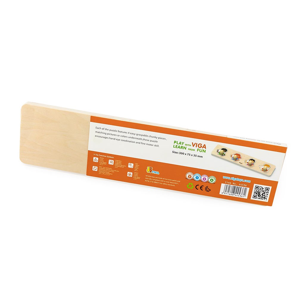 Čudovite, pisane otroške lesene puzzle s ročaji Viga. Otrokom zaradi ročajev puzzle lažje držijo v prstih in jih enostavneje vstavijo na predvidena mesta. Prav tako pomaga izboljšati ročno spretnost in okretnost ter hkrati uči otroka prepoznavati oblike in barve. Prispeva k razvoju motorike, izboljšuje koordinacijo in opazovalne sposobnosti otroka. Pakiranje vsebuje 4 kose. Namenjeno otrokom od 12 mesecev naprej. Prve puzzle za vaše male otroke so v zelo izrazitih barvah, preprostem dizajnu in velikih kosih. Naša prednost je varnost in kakovost naših izdelkov, zato so barve, uporabljene na igračah, netoksične in ustrezajo varnostnim standardom (EN71 in ASTM). Igrača je primerna tudi kot čudovito darilo za naše najmanjše. Dimenzija: 32x3x7,5 cm