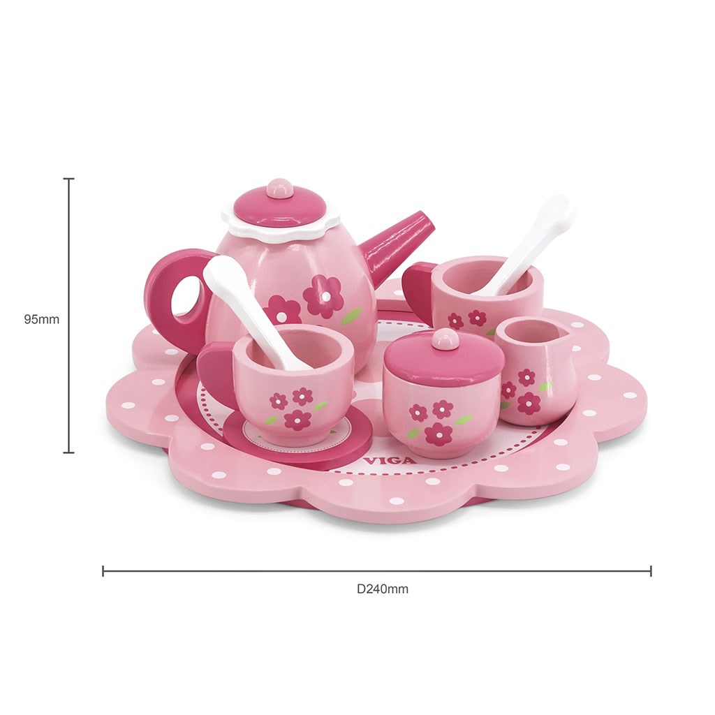 Lesena čajna garnitura VIGA obsega 12 delov - čajnik, mlečnik, sladkorničko, dva skodelici s krožniki in žličkami ter čudovit pladenj.