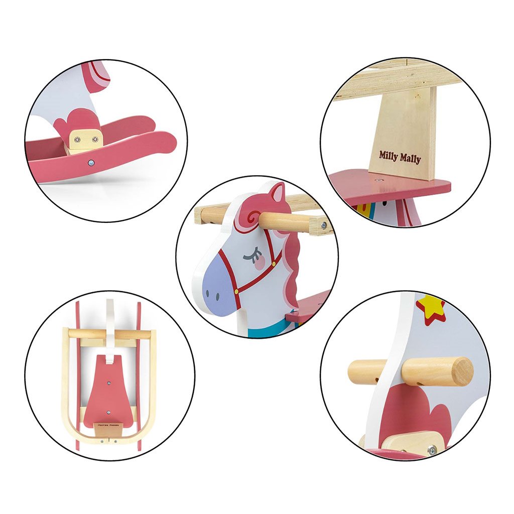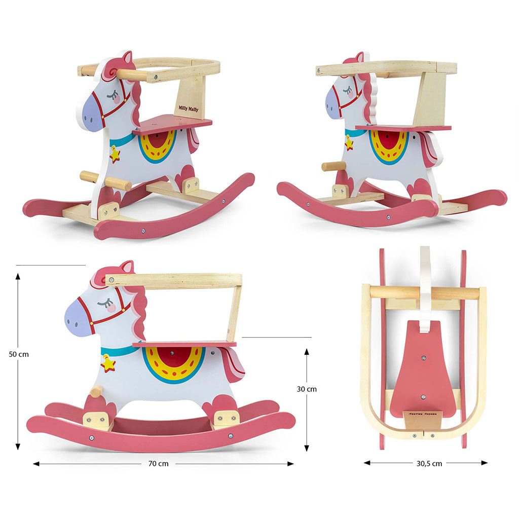 Edinstven gugalni konj Lucky blagovne znamke Milly Mally. Oblikovan je tako, da zadosti potrebam vsakega ljubitelja konj. Vse otroke navdušuje guganje na konju ... spominja jih na gugalno izkušnjo v maminih objemih. Naša igrača je izdelana iz lesa, ki je danes iskani material zaradi svojega brezčasnega videza.