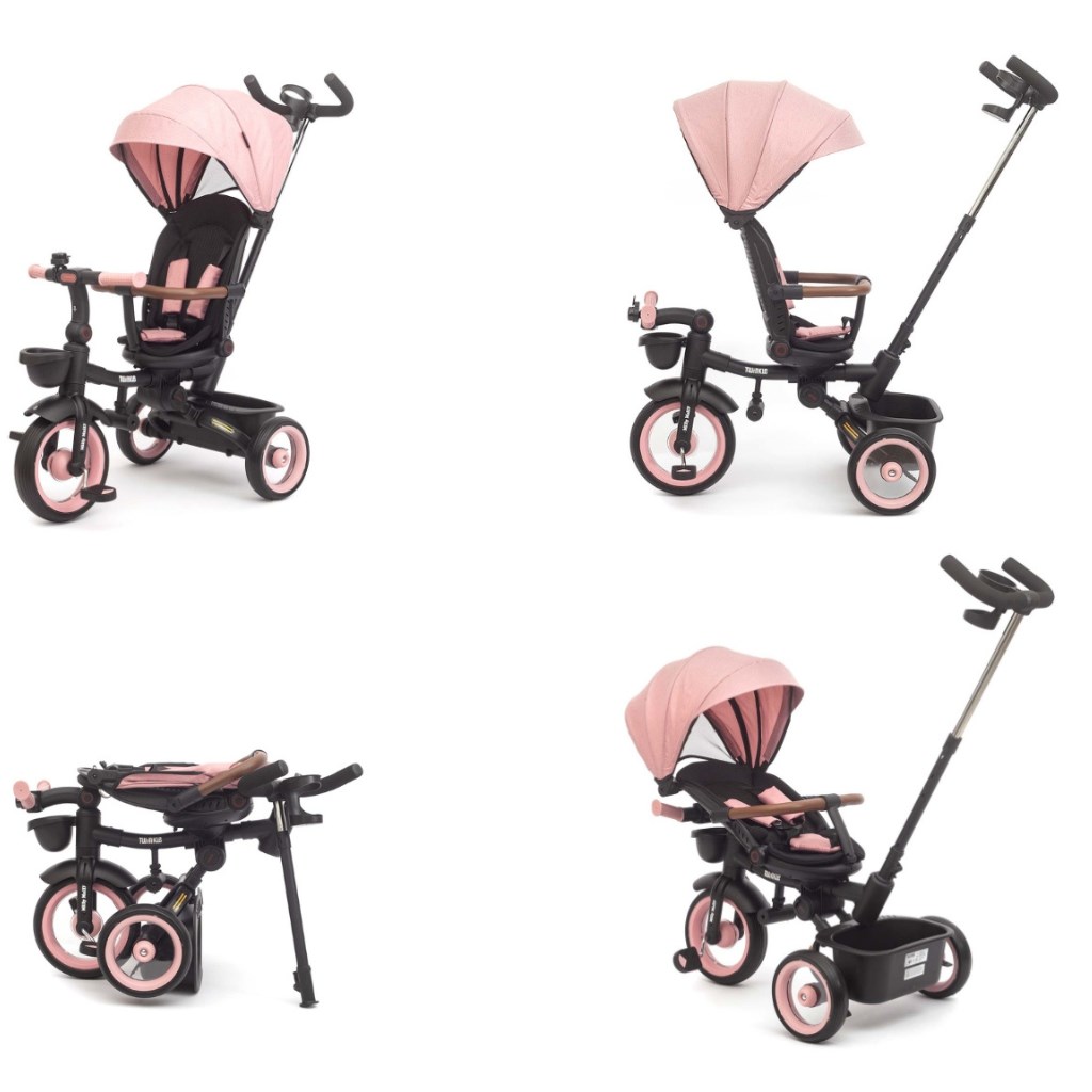 Twinkle je opremljen z nastavljivim ročajem, funkcijo prostega teka, zavoro, varnostnimi pasovi s zaščitniki ter udobnim trojnim naslonjalom in zagotavlja popoln nadzor in udobje za otroka in starše. Njena lahka, a trpežna jeklena konstrukcija, kolesa s penasto oblogo in krogličnimi ležaji, zložljiva konstrukcija ter praktične lastnosti, kot so mrežasta streha, LED lučka, nosilec za pijače in dva shranjevalna zaboja, jo delajo popoln izbor za vsako priložnost – v mestu, na sprehodu ali izletu. Po odstranitvi ročaja, ograj in strehe lahko Twinkle uporabljate kot klasično trokolko.