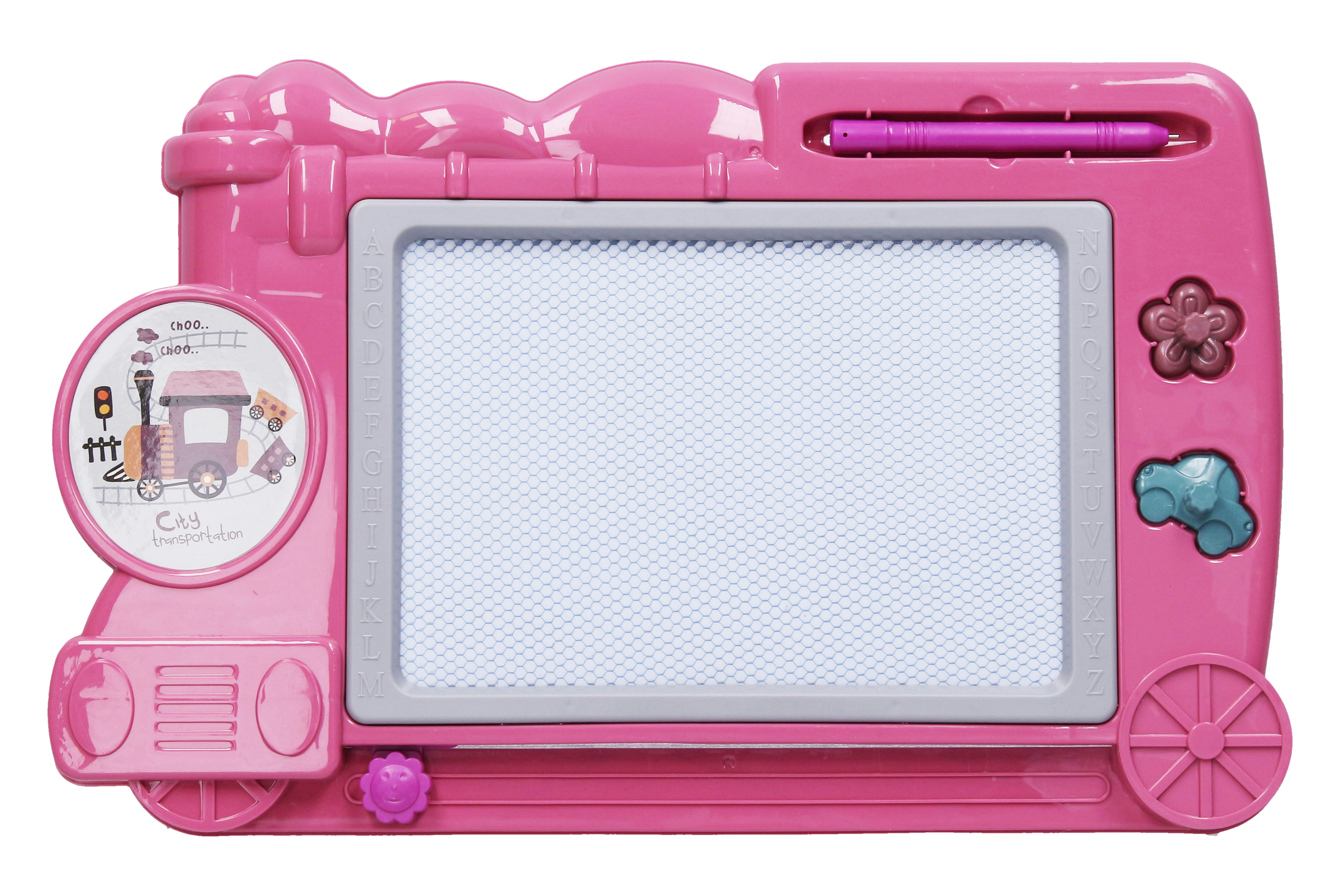 Magická kreslící tabulka. Velikost 33cm. Obrázek se maže posuvníkem. Obsahuje tužku na kreslení, magnetky na razítkování na tabulku.