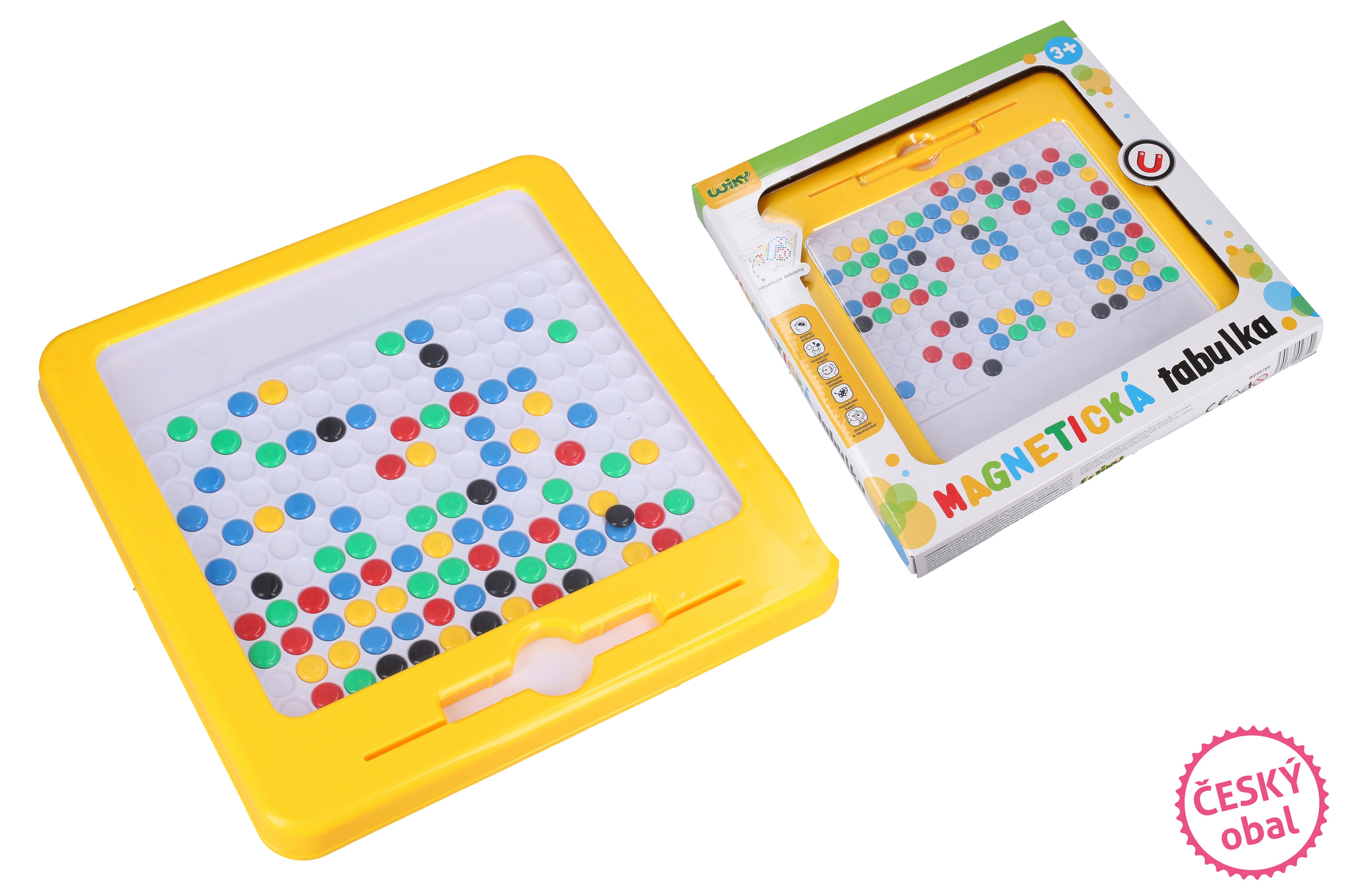Magnetická tabulka. Velikost 25cm. Pomocí přiložené magnetické tužky se umísťují barevné magnetky na potřebná místa a tvoří se tak libovolný obrázek. Obsahuje předlohy s různými obrázky. Přitlačením magnetické tužky na tabulku se magnetka přichytí k tužce, dá se tak přemístit a oddálením tužky od tabulky magnetka spadne na příslušné místo.