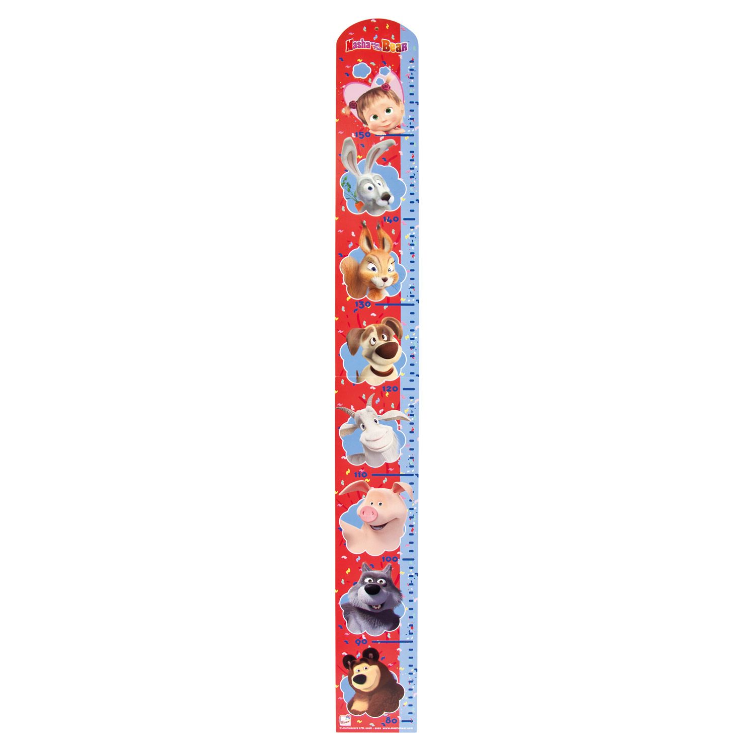 Barevný metr vyrobený z MDF-desky potištěný vtipnými motivy ze známého dětského seriálu „Máša a medvěd“ je skvělou dekorací do každého dětského pokoje. Malý otvor v záhlaví umožňuje snadné připevnění na zeď. Tištěná stupnice pro měření je v rozmezí od 80 cm do 160 cm výšky.