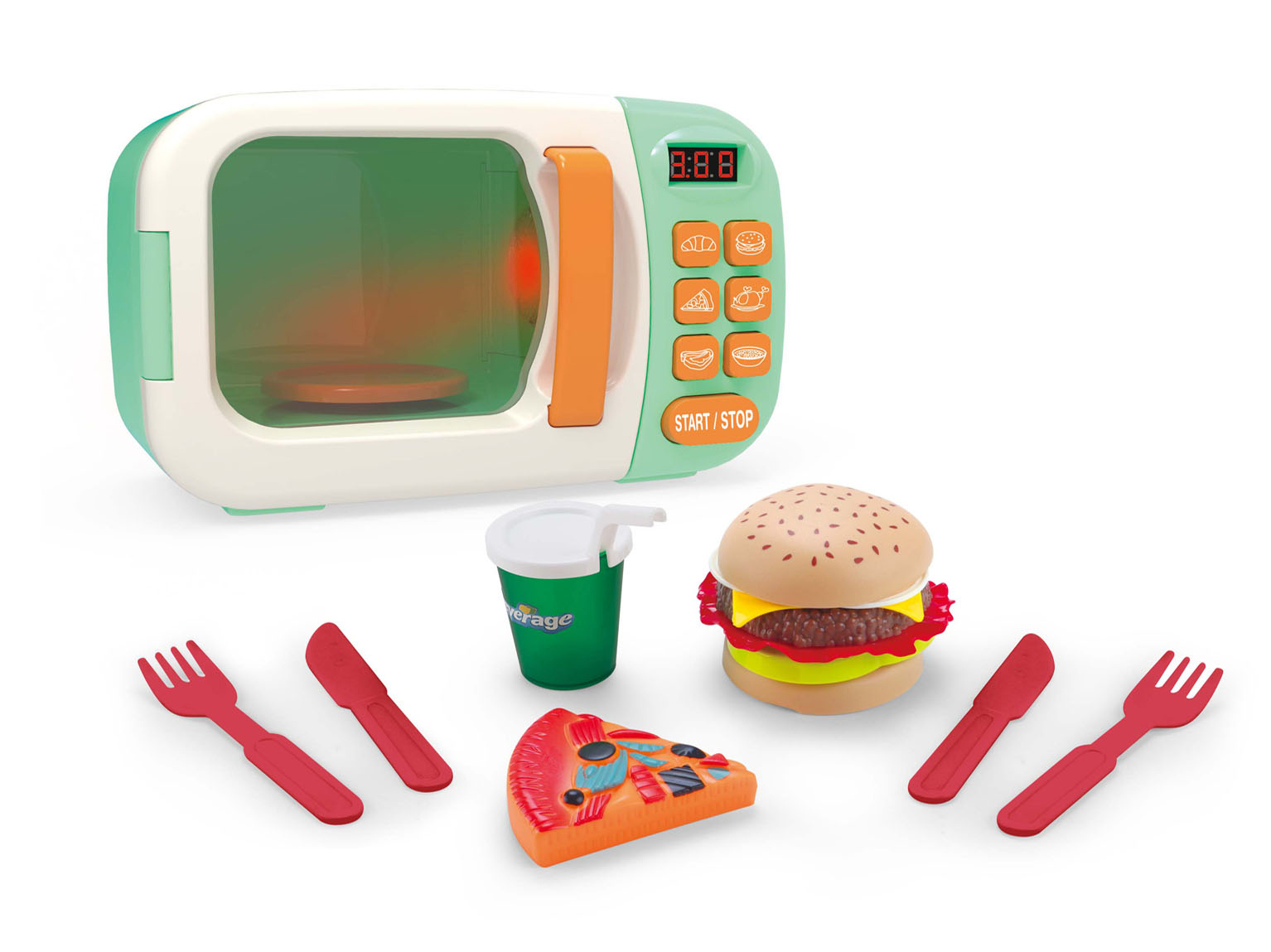 Mikrovlnka s efekty. Velikost 23x10x15 cm. Baterie 3xAA, součástí balení. Obsahuje mikrovlnku, hamburger, kousek pizzy, příbor a pití. Vydává zvukové a světelné efekty.