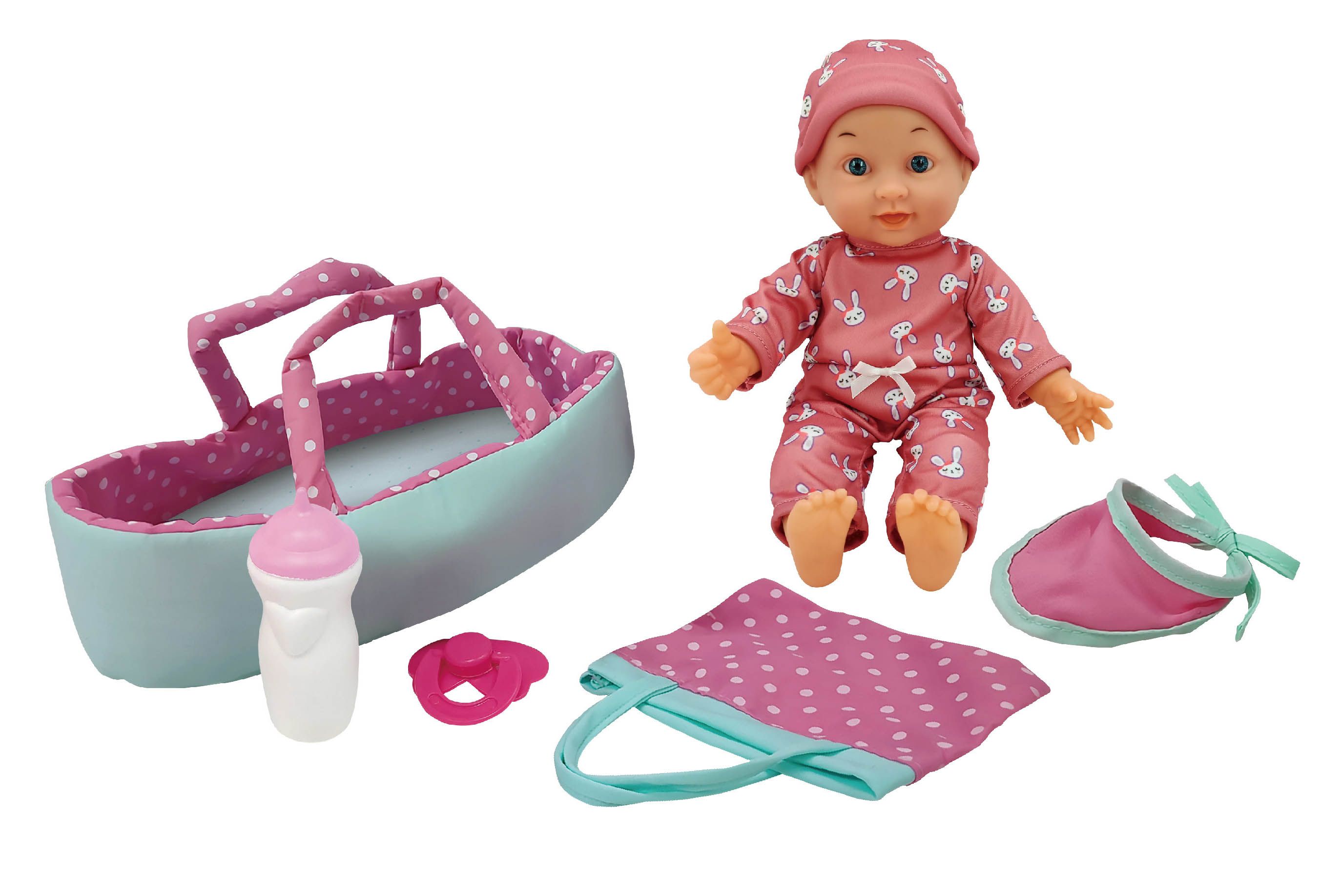 Miminko měkké s přenosnou taškou. Velikost 30 cm. Obsah - miminko, přenosná taška, bryndák, láhev. 2 varianty - růžová, bílá.