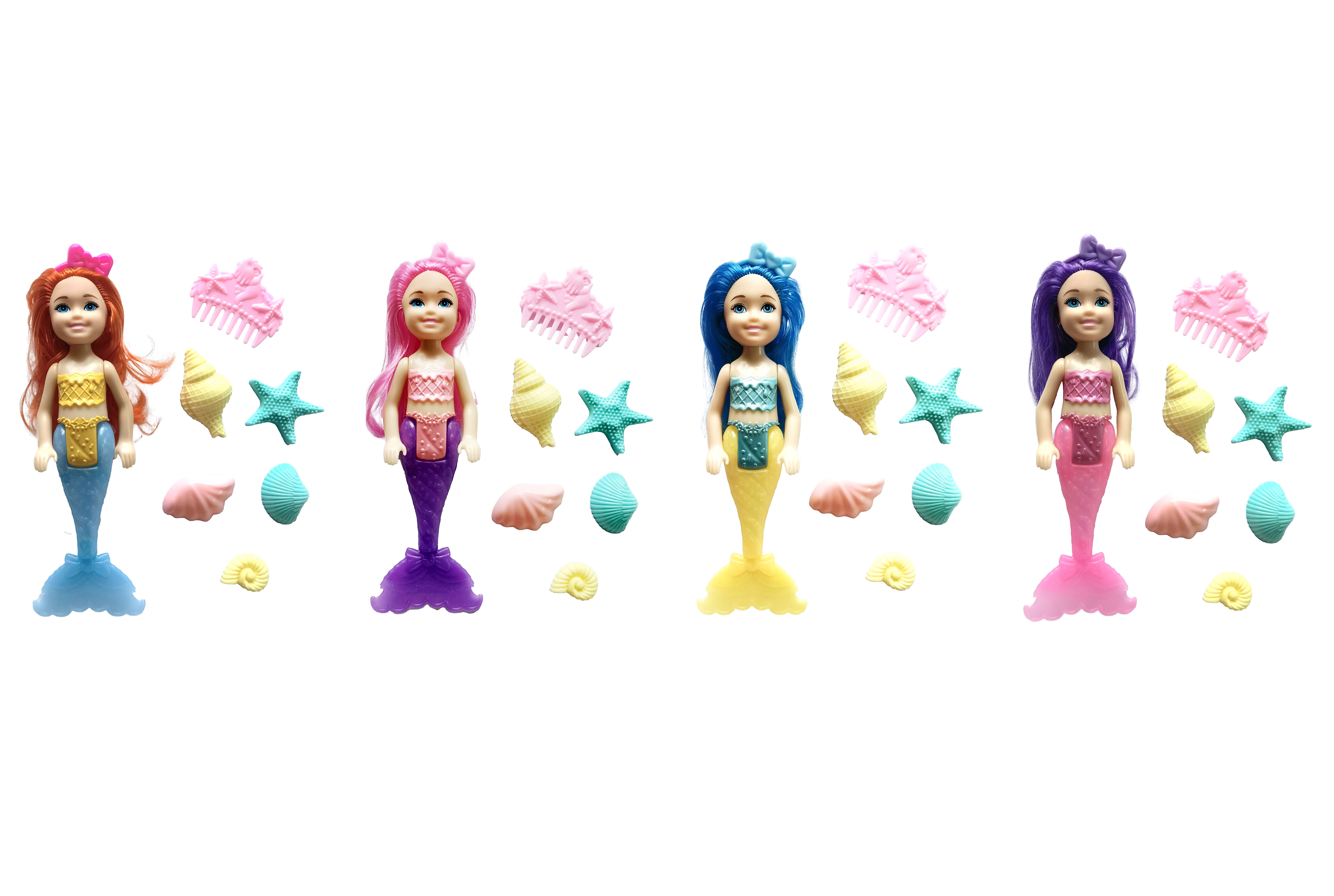 Mořská víla. Velikost 15 cm. Obsah balení - víla, hřeben, mušle. 4 varianty - fialová, růžová, oranžová, modrá.