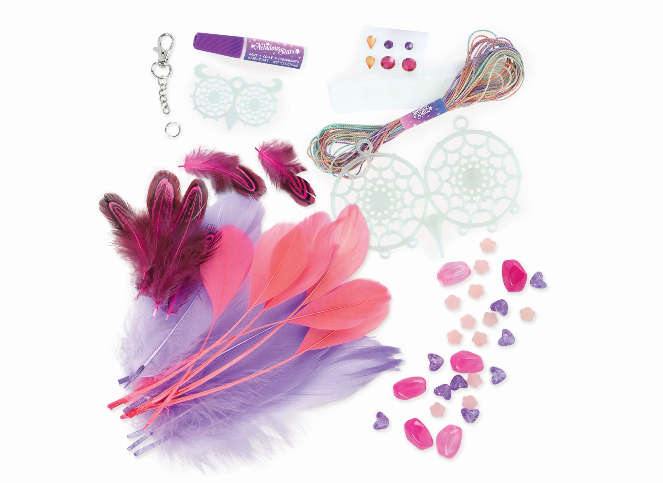 Nebulous Stars Lapač snů. obsah: 2 lapače snů, bavlněná nit, 18 peříček, 27 korálků, 6 samolepících kamínků, lepidlo na kamínky, 12 lepicích bodů, přívěsek na klíče s řetízkem, kroužek, Petuliin příběh, návod. Lapač svítí ve tmě.