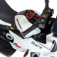 Dječija električna motorna kolesa Rare Baby Mix je opremljena baterijom 6V7AH i dva motora snage 380. Ima funkciju jednostavnog pokretanja na jedno dugme, koja omogućava vožnju naprijed i nazad. Motorna kolesa su opremljena muzikom, dečijim pesmama, karticom za čitanje podataka za rano obrazovanje, tri kotača i LED farovima. Udobnost osigurava kožni sedište.