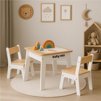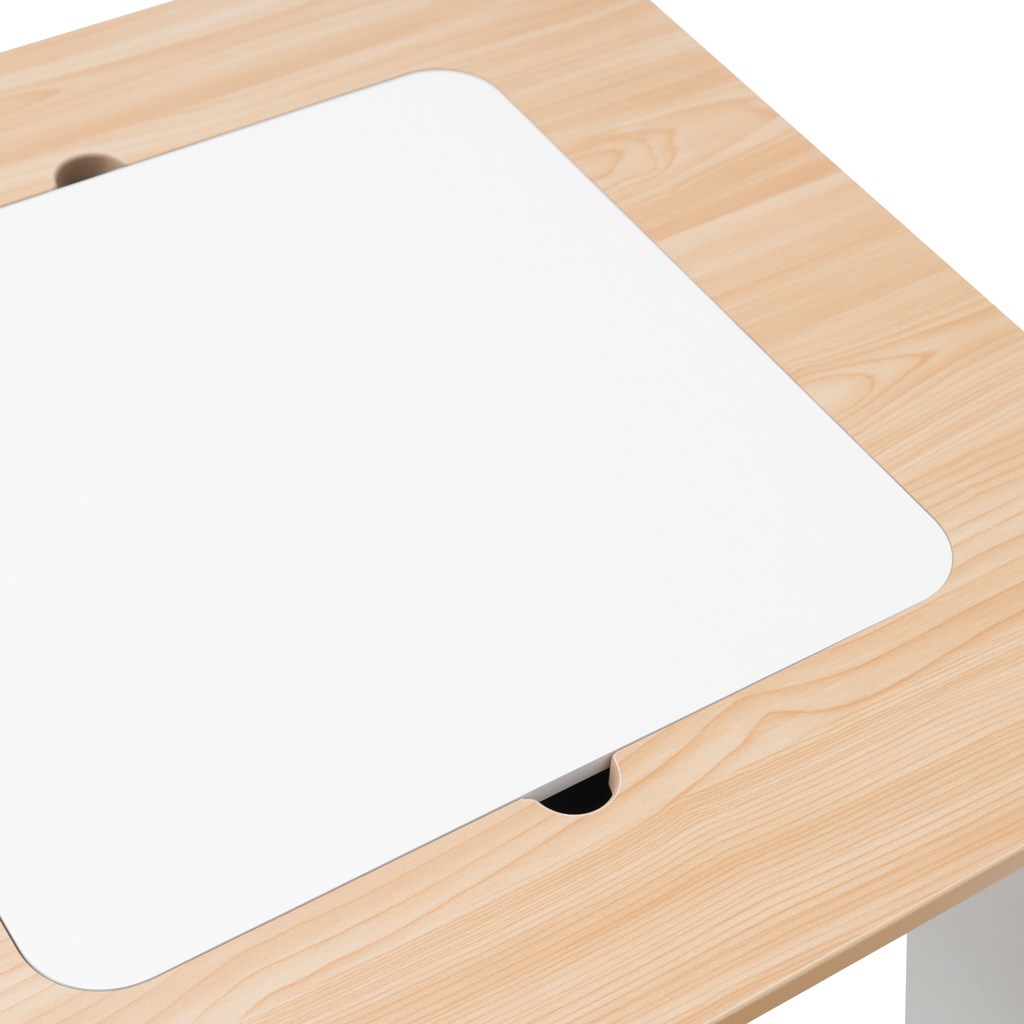 Sestava seta vključuje mizo z dvema stoloma, izdelano iz trpežnega materiala, ki zagotavlja stabilnost in dolgo življenjsko dobo. Miza je opremljena s praktično snemljivo ploščo – pod njo se nahaja prostor za shranjevanje, kamor lahko enostavno skrijete barvice, papirje, drobne igrače ali kocke. Tako imajo otroci potrebne stvari vedno pri roki in hkrati ohranjajo red.