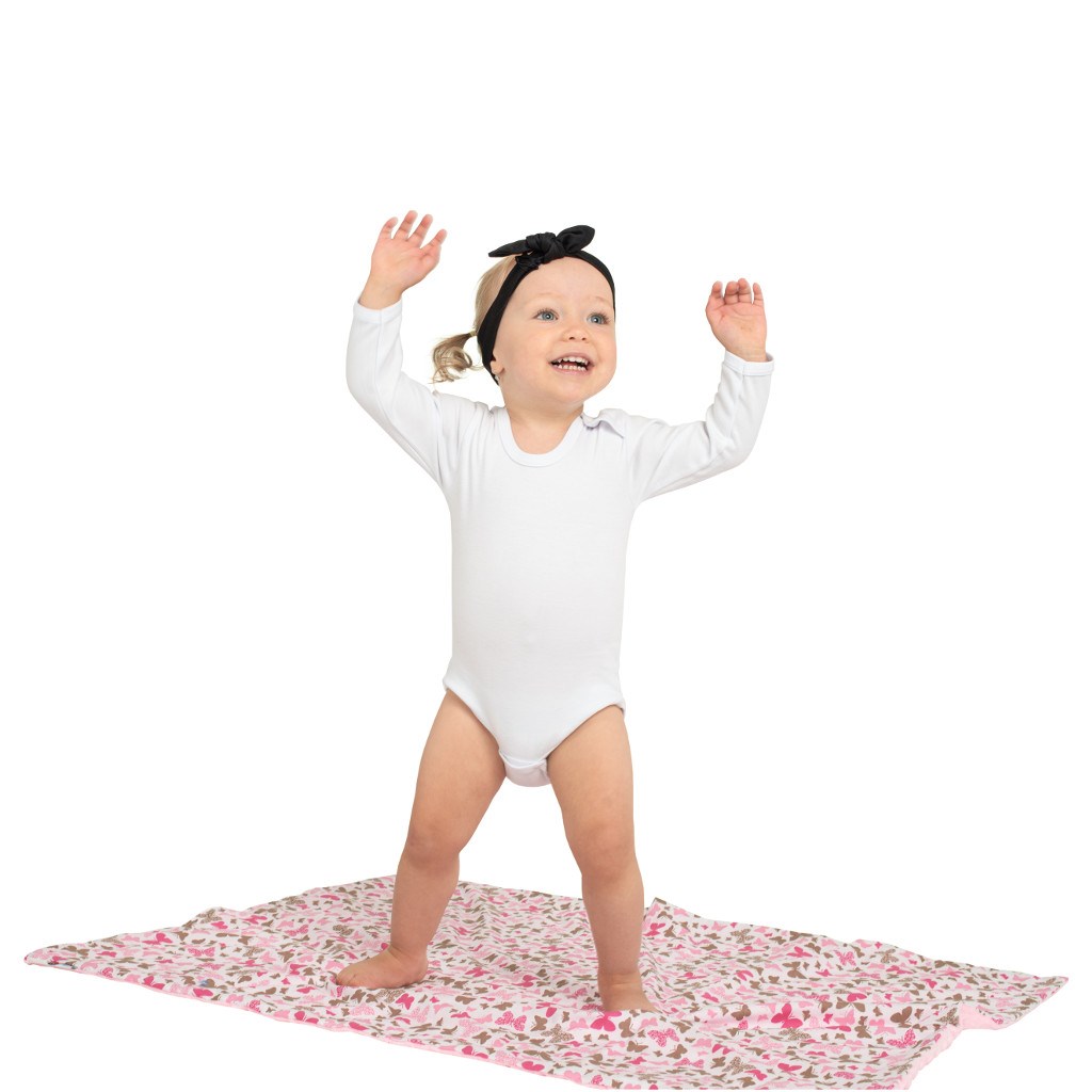 Čudovita otroška odeja New Baby. Odeja je izdelana iz dveh vrst tkanin. Prva je zelo mehka in prijetna na dotik, nežna Minky tkanina z izboklinami za stimulacijo senzomotoričnih sposobnosti, druga pa je 100% bombaž z izvirnimi slikami in vzorci, ki otrokom pomagajo pri učenju novih stvari in razvoju njihove domišljije. Idealna je za dojenčke od rojstva ter tudi za večje otroke. Odejo lahko uporabljate tako doma kot zunaj, v vozičku, posteljici, avtosedežu ali kot igralno odejo. Izdelana je iz zelo kakovostnega materiala, ki ne spusti barve in ne povzroča alergijskih reakcij. Dimenzije: cca 80x102 cm. Sestava: ena stran: 100% bombaž, druga stran: 100% poliester. Odeja je zelo lepa in drugačna od drugih.