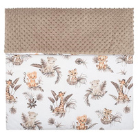 Otroška odeja češke blagovne znamke New Baby Safari je izdelana iz dveh vrst tkanin. Prva je zelo mehka in na dotik prijetna, nežna Minky tkanina z izboklinami za stimulacijo senzomotorike, druga pa je 100 % bombaž z izvirnimi slikami in vzorci, ki otrokom pomagajo učiti se novih stvari in razvijati njihovo domišljijo. Odeja je debelejša in toplejša zahvaljujoč polnilu z antialergičnim vlaknom. Idealna je tako za dojenčke od rojstva kot tudi za večje otroke. Odejo lahko uporabljate doma, na prostem, v vozičku, posteljici, avtosedežu ali kot igralno odejo. Izdelana je iz zelo kakovostnega materiala, ki ne spušča barve in ne povzroča alergijskih reakcij.
