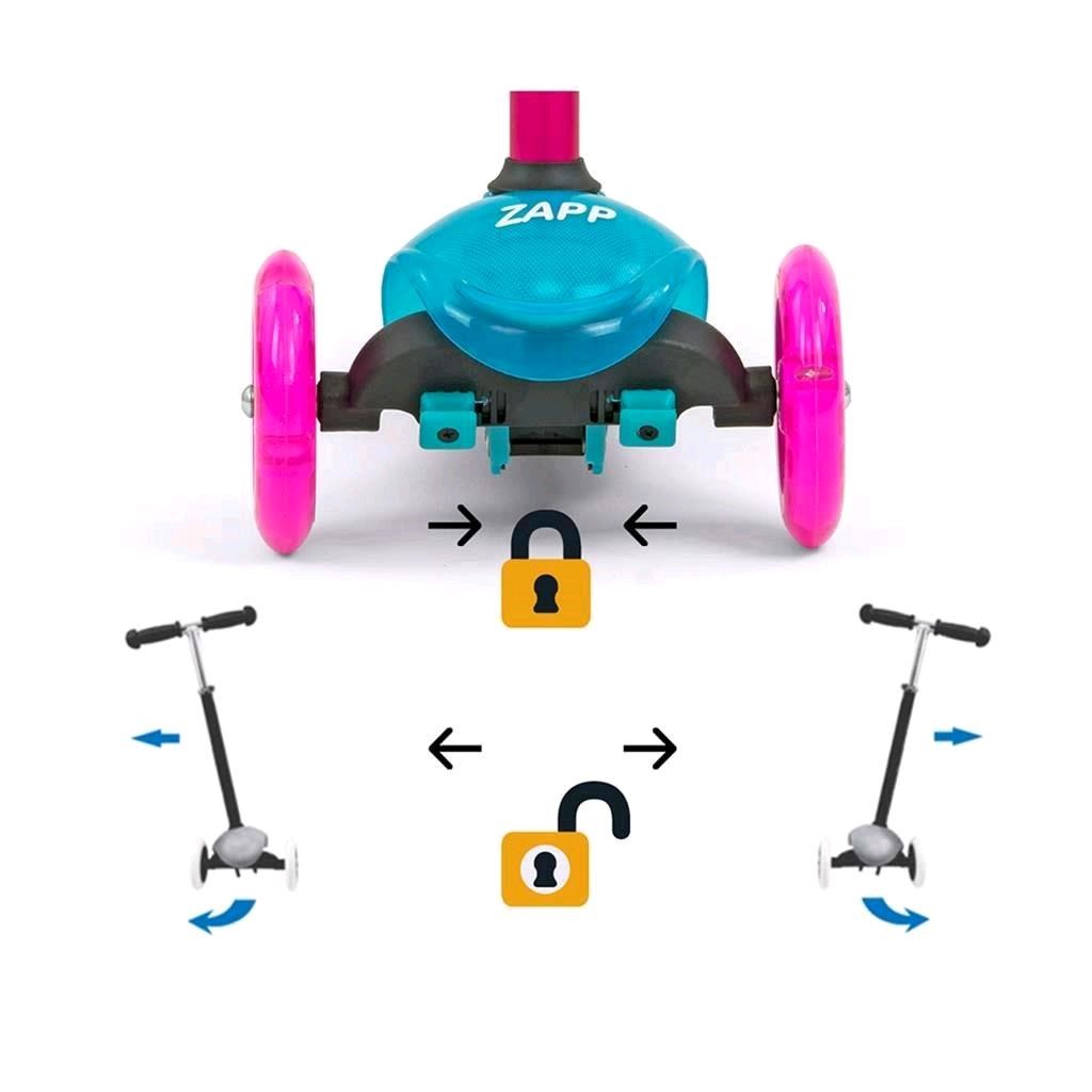 Da bi zadovoljili potrebe naših majhnih dirkačev, smo ustvarili skiro ZAPP. Je idealna rešitev za aktivne otroke, ki imajo radi gibanje. Zapp je izdelan iz kakovostnih materialov, kar ga naredi odličnega za sprehode ali norčije po hiši. Kovinska konstrukcija zagotavlja trpežnost izdelka. Skelet ima tudi zavoro in blatnik na zadnjem kolesu. Krmiljenje in zavijanje delujeta na principu spreminjanja telesne ravnotežja. Velika prednost skiroja so 3 kolesa, ki nudijo stabilnost in varnost. Otroke bo navdušilo tudi svetleče sprednje kolo med vožnjo.