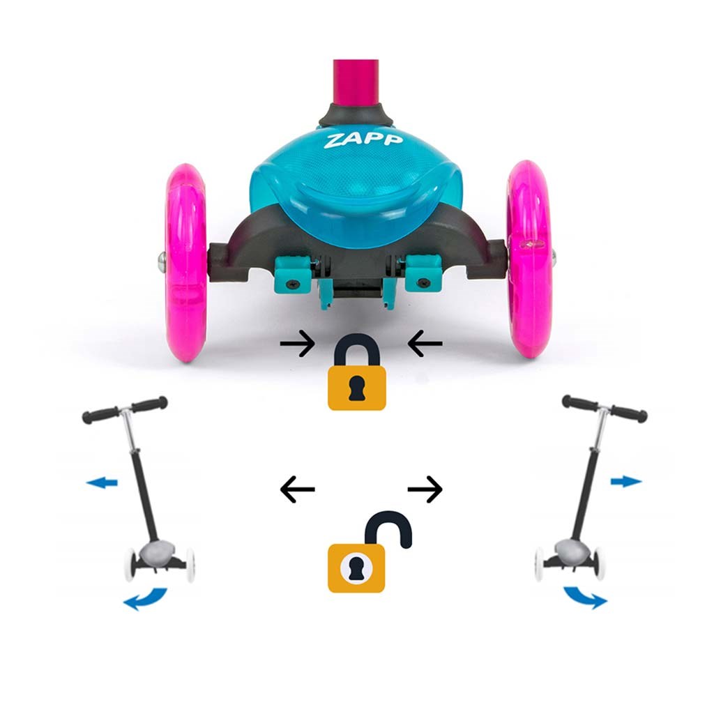 Da bi zadovoljili potrebe naših majhnih dirkačev, smo ustvarili skiro ZAPP. Je idealna rešitev za aktivne otroke, ki imajo radi gibanje. Zapp je izdelan iz kakovostnih materialov, kar ga naredi odličnega za sprehode ali norčije po hiši. Kovinska konstrukcija zagotavlja trpežnost izdelka. Skelet ima tudi zavoro in blatnik na zadnjem kolesu. Krmiljenje in zavijanje delujeta na principu spreminjanja telesne ravnotežja. Velika prednost skiroja so 3 kolesa, ki nudijo stabilnost in varnost. Otroke bo navdušilo tudi svetleče sprednje kolo med vožnjo.