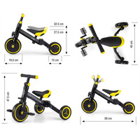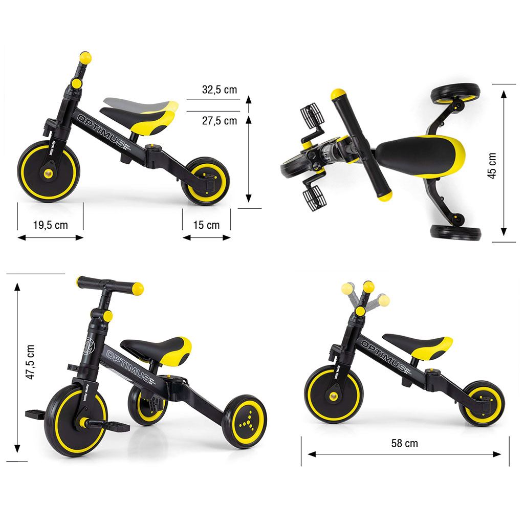 Univerzalni otroški trikec Milly Mally 3v1 Optimus je bil zasnovan tako, da postane najboljša izbira za vašega malega dirkača. Zaradi stabilne konstrukcije nudi otroku najvišjo raven varnosti in mu olajša pridobivanje novih spretnosti. Največja prednost tega trikeca je njegova spremenljivost. Ko otrok obvlada osnove vožnje, lahko priključimo pedala ali ga v trenutku spremenimo v klasično enoslednico. Penaste gume odlično absorbirajo udarce, zagotavljajo dobro oprijemljivost, udobje med vožnjo in ne utrudijo vašega malega dirkača. Dovoljšnja razdalja med kolesi zagotavlja izjemno stabilnost ter varnost med uporabo doma in zunaj. Omejevalnik preprečuje prevračanje krmila.