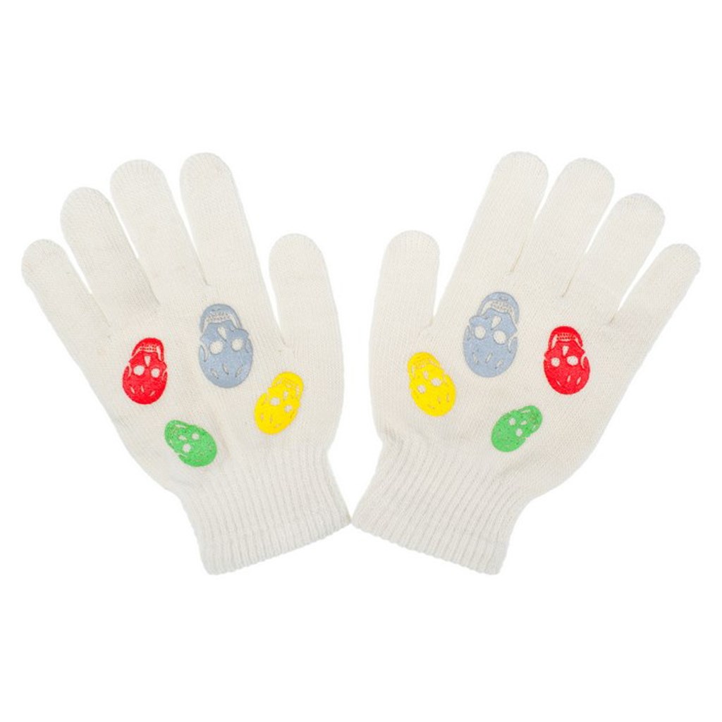 Čudovite otroške zimske pletene rokavice New Baby. Rokavice imajo elastičen rob, ki se da zategniti. Rokavice krasijo slike barvitih lobanj. Dolžina je približno 18 cm. Sestava: 85% poliester, 15% elastan.