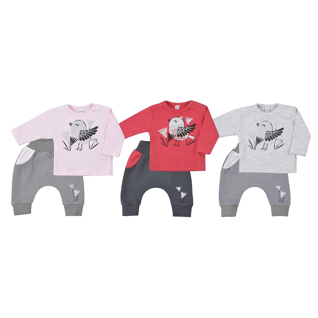 Ljubka 2-delna bombažna komplet Koala Birdy. Souprava vključuje hlače in majico. Hlače imajo moden kroj z nizkim sedlom, kar jim daje pravi šmink, so okrašene z motivom in zaključene s širokim elastičnim robom. Majica je okrašena z ljubkim motivom. Praktično zapiranje na gumbih na naramnicah zelo olajša obleko. Komplet je natančno šivan in izdelan iz zelo prijetnega in mehkega materiala, v katerem se bo vaše dojenčke počutilo zelo udobno. Primeren je ne le za voziček, avtosedež, temveč tudi kot udobna obleka za doma. Material: 100% bombaž.