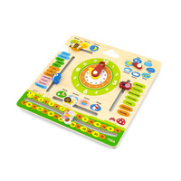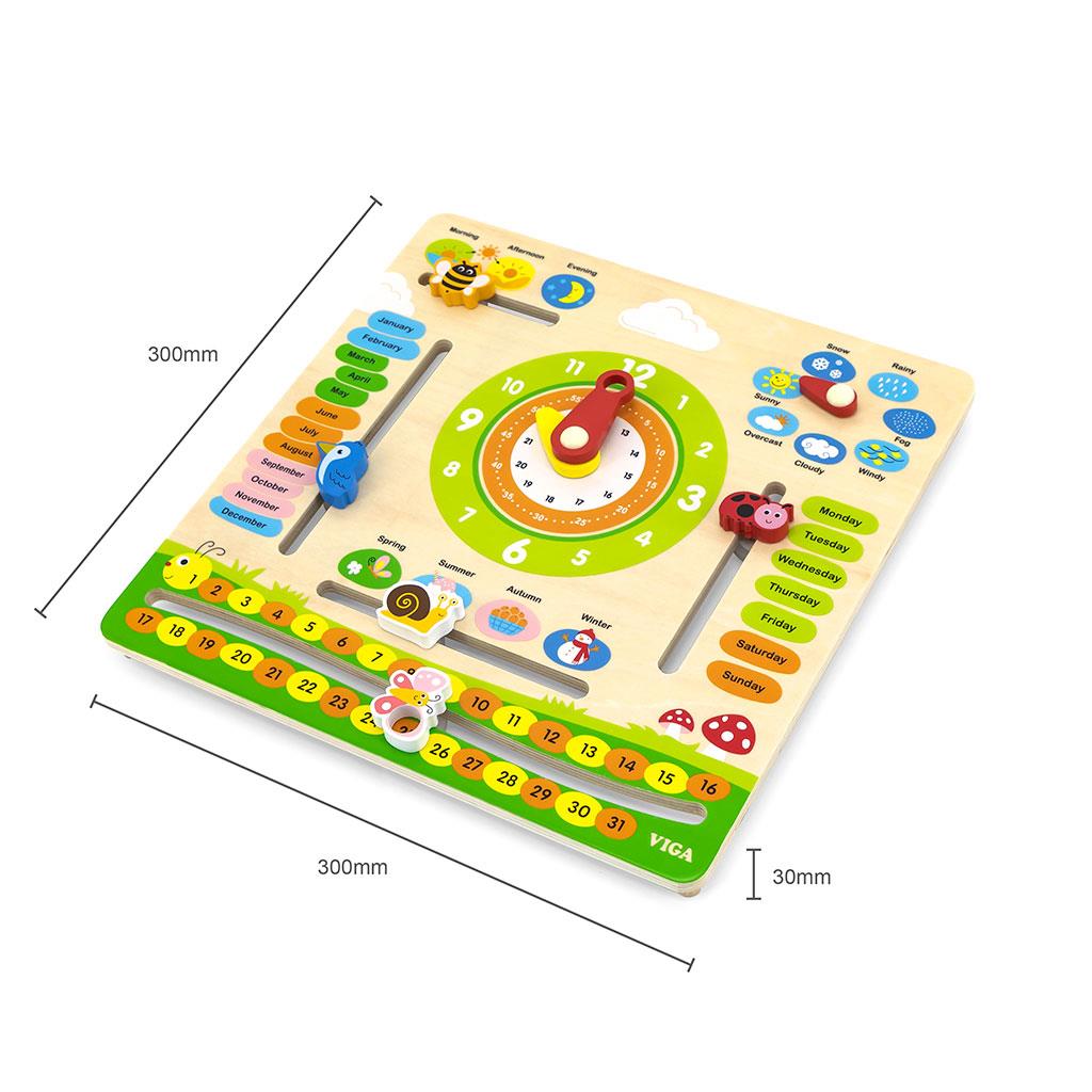 Odkritje sveta z leseno mizo z uro v angleščini podjetja Viga Toys je idealen "izobraževalni" in darilni komplet, primeren za ure angleščine kot didaktični material. Učenje pregledovanja analognih ur bo z Viga ploščo enostavnejše, igra s koledarjem pa bo podprla učenje branja in pisanja datuma. Otrok se bo naučil imen mesecev, dni v tednu, letnih časov in dni ter pojmov, povezanih s vremenskimi razmerami v angleščini. S poučno ploščo bodo lahko hitri učenci raziskovali in se učili ter se ob tem zabavali. Komplet za učenje časa je prav tako primeren za razvoj poMontessori metodi. Idealna igrača za obesiti doma, v vrtcu ali šoli.