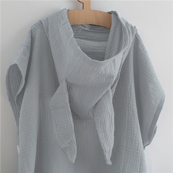 Otroška muslinova pončo New Baby Feeling. Stilsko pončo, ki ni primerno le za doma, ampak tudi za plavanje ob bazenu ali vodi. Muslinovo pončo je zaradi materiala lahko, zračno in lepo vpija. Pončo bo zaščitilo otroka pred mrazom in bo služilo tudi kot nežna brisača. Zaradi prostornega edinstvenega kroja in ljubkih ušes bo otrokom prineslo veliko veselja. S svojim krojem bo raslo z otrokom in se prilegalo vsaki postavi. Izgleda odlično in ga je mogoče uporabljati skozi vse leto. Za lažje oblačenje in slečenje so na boku gumbi. S tem se ustvari prostor za roko ali pa se kroj pusti ohlapen. Sestava: muslin-100% bombaž. Dimenzije: 50 cm brez kapuce, širina: 59 cm.