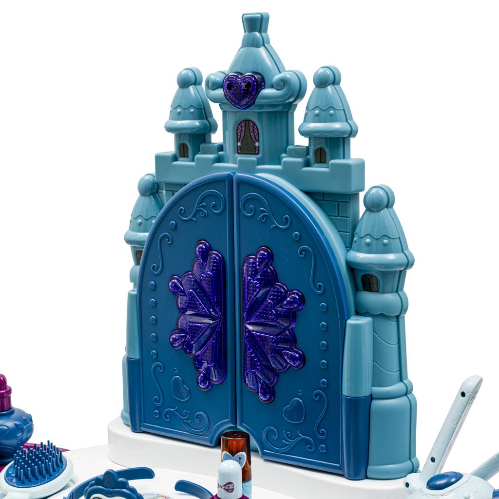 Otroška toaletna mizica z taburetom vključuje set maket kozmetike, kot so fen, glavnik, laki za nohte, prstani, cvetlice za lase, zapestnice, ogrlica in nalepke. V setu je tudi umetna palica, ob pritisku na palico se odpre ogledalo. Toaletna mizica ima predal za shranjevanje drobnarij. Set zahteva 5AA baterij, ki niso priložene.