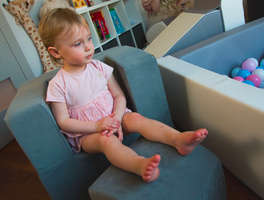 Sedež se zelo hitro spremeni v priljubljeno mesto vašega otroka za počitek ali igro. In zaradi svojega vsestranskega in elegantnega sloga se enostavno prilega v notranjost vsake sobe. Sestavljen je iz dveh delov. Iz kvadra in fotelja, ki ima zložljivo naslonjalo za roke. Po zloženiu naslonjala za roke, je le še potrebno dodati kvader v sredino in iz fotelja nastane sedež-lenivec.