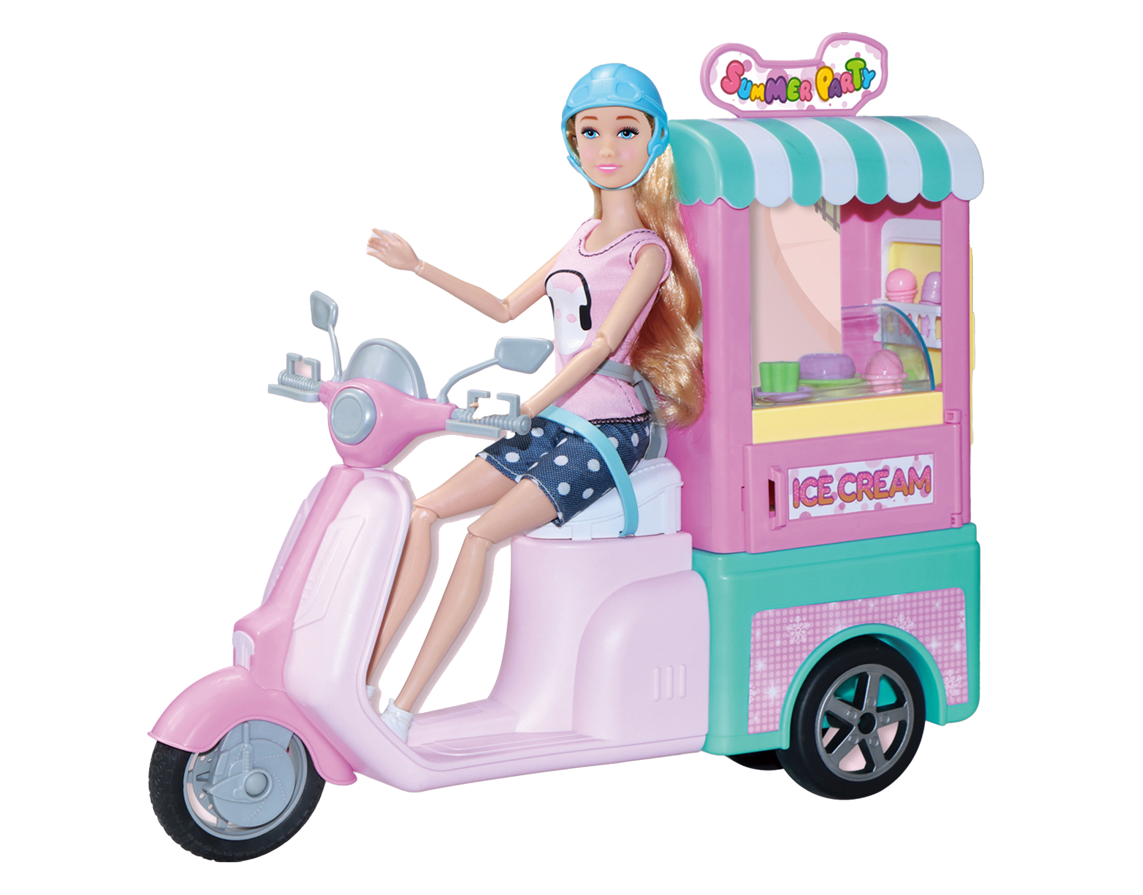 Panenka zmrzlinářka. Velikost 30 cm. Obsahuje panenku, zmrzlinářský skútr. helmu, doplňky.