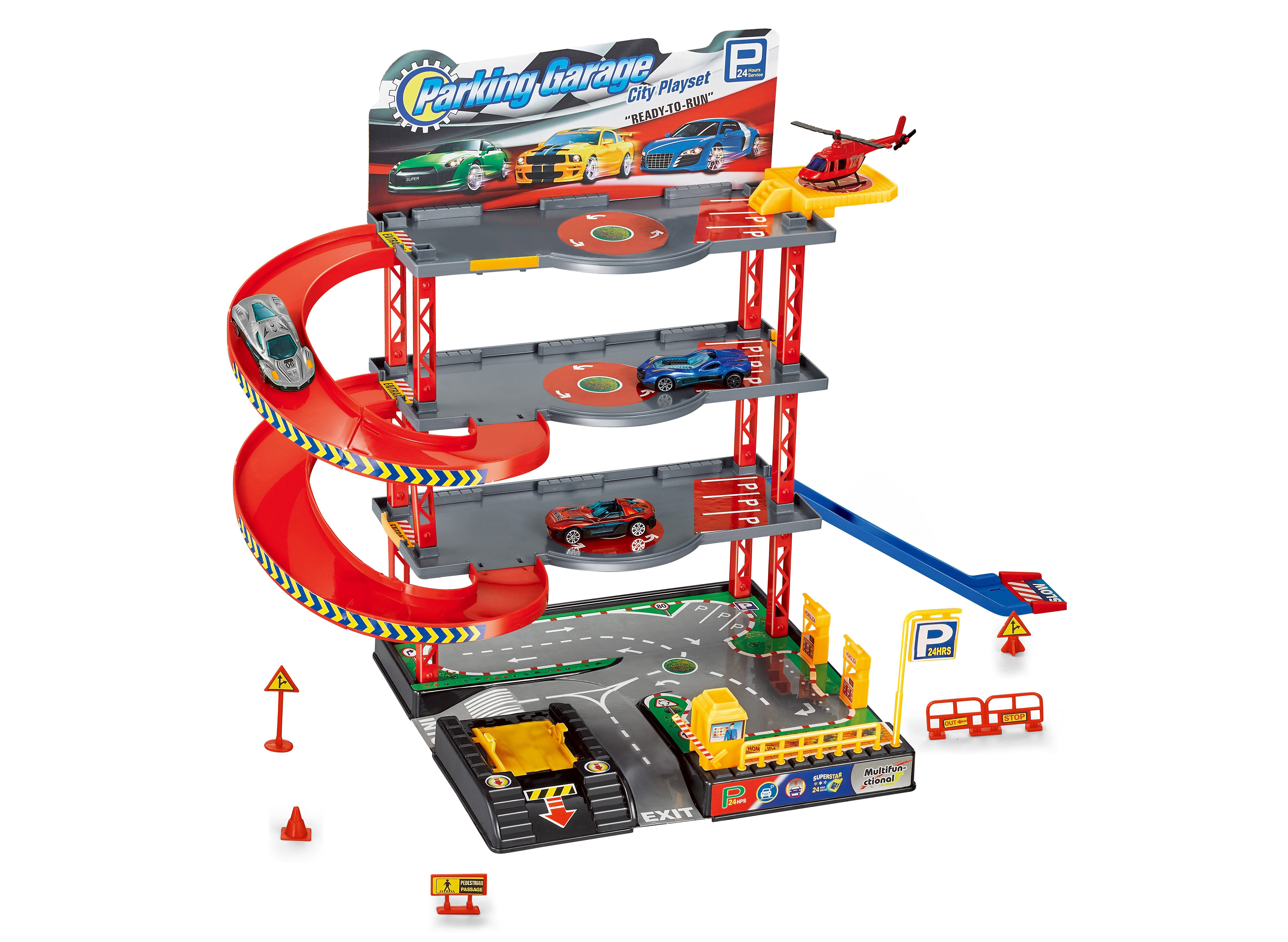 Parkovací stanice se 3 kovovými auty a vrtulníkem. Rozměry 59x27x39 cm. Velikost auta 7 cm. Stanice obsahuje 3 kovová auta, 1 kovový vrtulník, heliport, čerpací stanici, závoru.