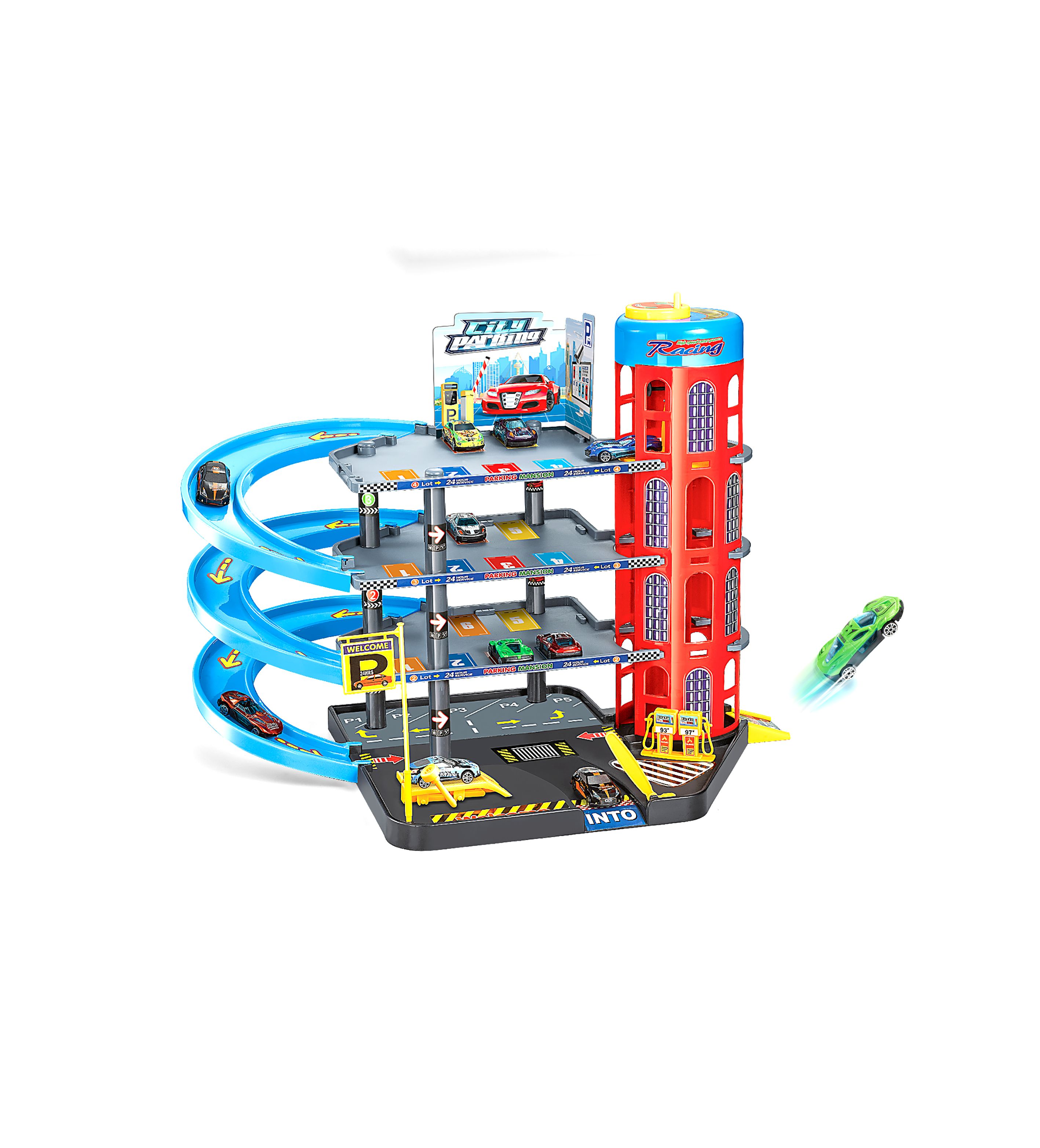 Parkovací stanice se 6 kovovými auty. Rozměry 55x40x44 cm. Velikost auta 7 cm. Stanice obsahuje 6 kovových aut, ruční výtah, čerpací stanici, nabíječku elektrických aut, zvedací plošinu, závoru.