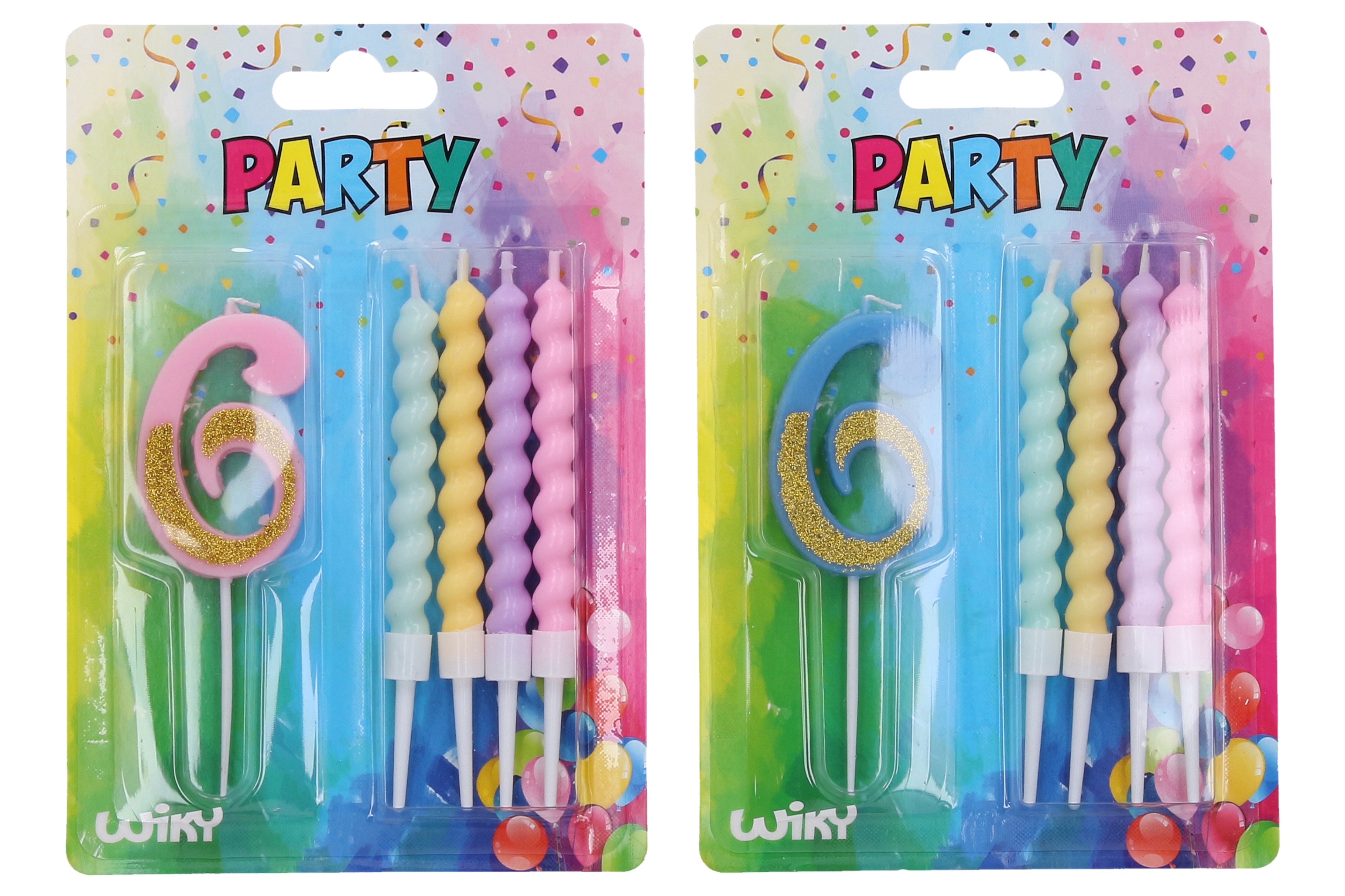 Párty svíčka číslo 6 + 4ks svíček. 2 barevné varianty - modrá, růžová.