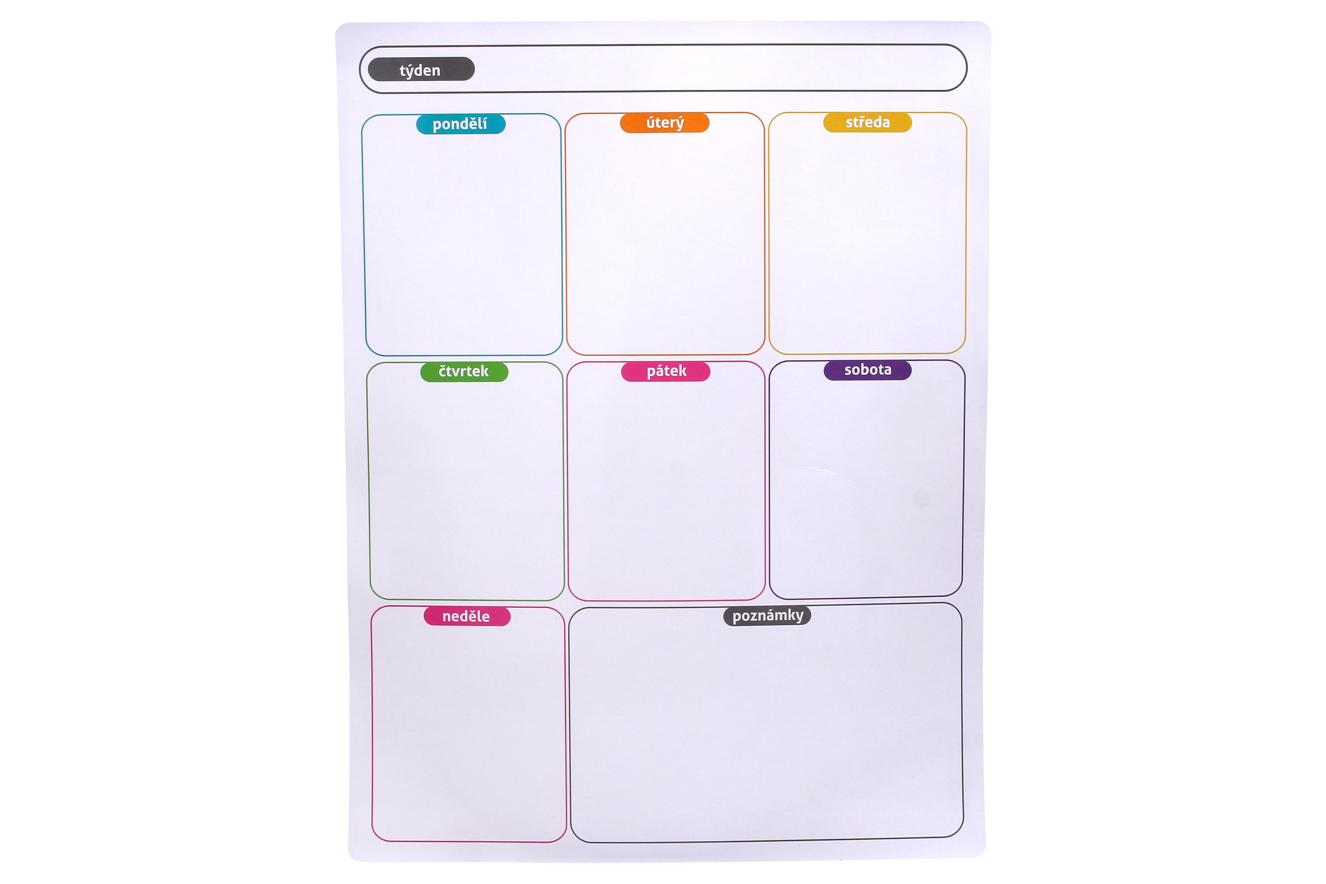 Pro přehled ve schůzkách, snadnější plánování pracovního týdne či zapisování školních úkolů je magnetický týdenní plánovač ideální. Kdykoliv můžete použitím suché stěrky napsaný text smazat a přepsat stírací fixou.