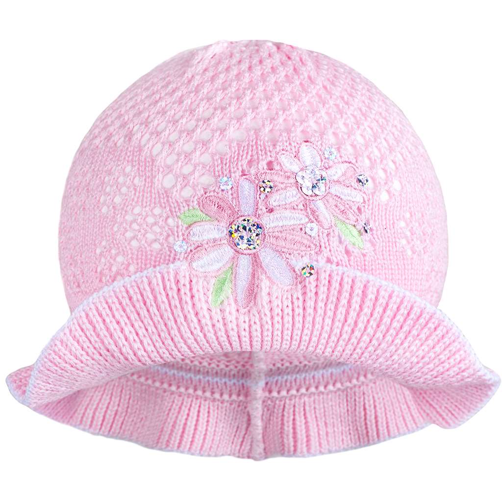 Pomladni pleten klobuček New Baby. Klobuček krasijo slike cvetlic in pisan rob. Klobuček je narejen iz dihalnega materiala, zato je primeren za pomladne in jesenske dni. Idealno za majhne in večje deklice. Sestava: 100% bombaž. Material je elastičen. Obseg okoli glavice je približno 40-50 cm.