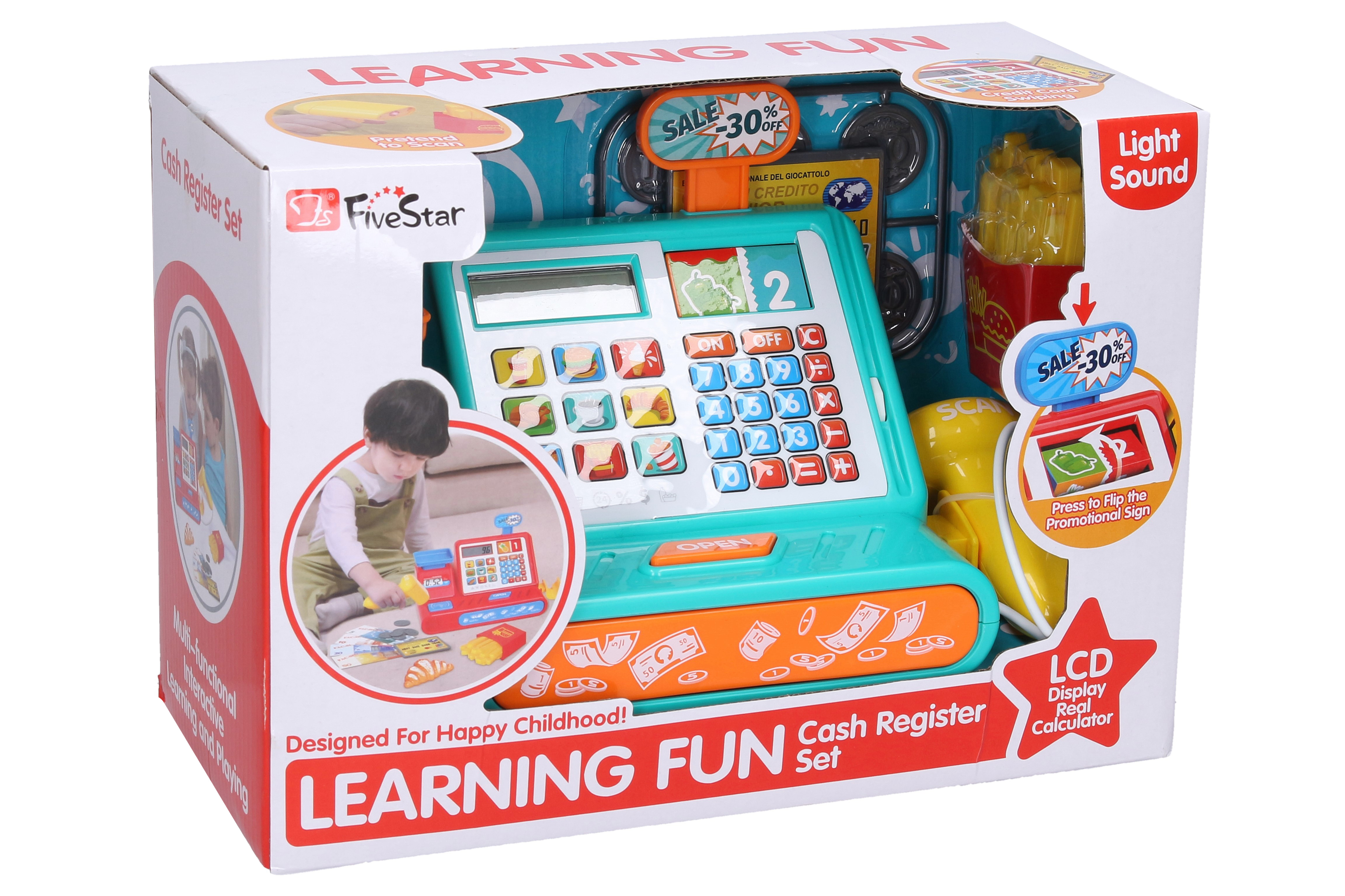 Pokladna. Velikost 26x13x17 cm. Obsahuje pokladnu s výsuvným šuplíkem na mince, displejem a funkční kalkulačkou, potraviny, mince, kreditní kartu. 2xAA baterie nejsou součástí.