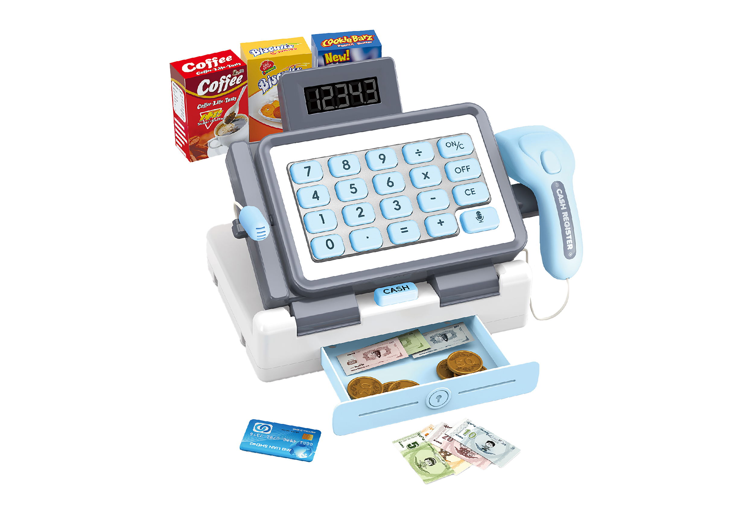 Pokladna s efekty modrá. Velikost 25x15x18,5 cm. Funkce kalkulačky, mikrofon, otevírací šuplík na peníze. Baterie 3xAA nejsou součástí.