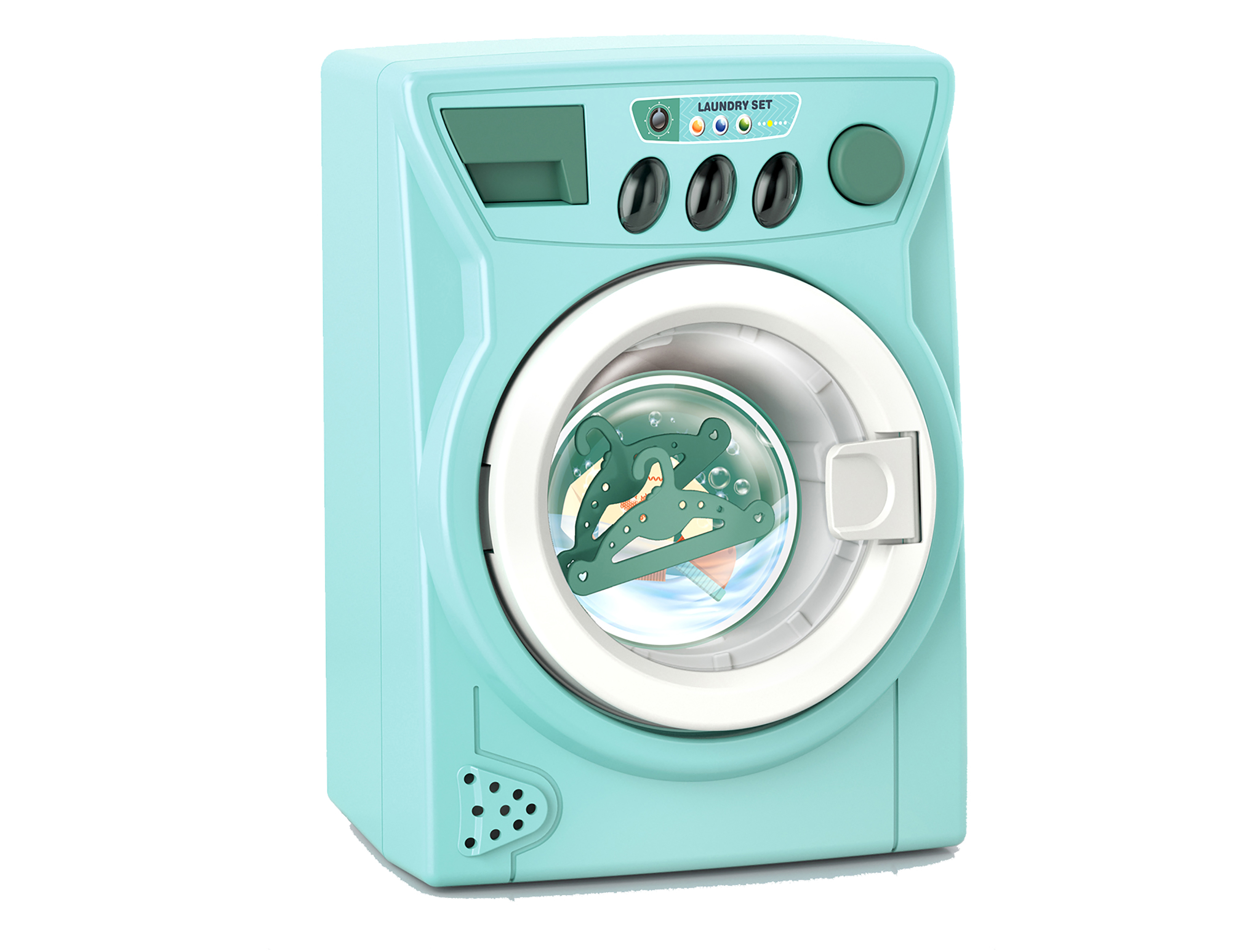 Pračka s efekty. Velikost 14 cm. Vydává světelné a zvukové efekty. Baterie 2xAA nejsou součástí balení. Přesné rozměry 10x8x14 cm.