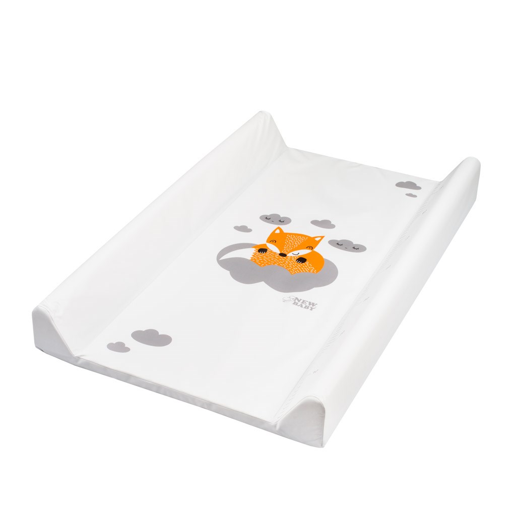 Praktična oblikovana previjalna podloga z modernim dizajnom New Baby Lisica iz nepremočljive plastične mase z motivom lisice in oblakov. Izdelek češke blagovne znamke. Podloga je napolnjena s poliesterom in ima dvignjene stranske dele. Ima trdo dno, možno jo je pritrditi na posteljico ali postaviti na previjalno stojalo. Izdelana je iz najkakovostnejše certificirane folije, ki ne vsebuje škodljivih snovi in je nežna do najbolj občutljive otroške kože. Odličen pomočnik pri previjanju in oblačenju dojenčka. Dimenzije: cca 50x80 cm, debelina cca 2,5 cm, višina robov 8,5 cm.