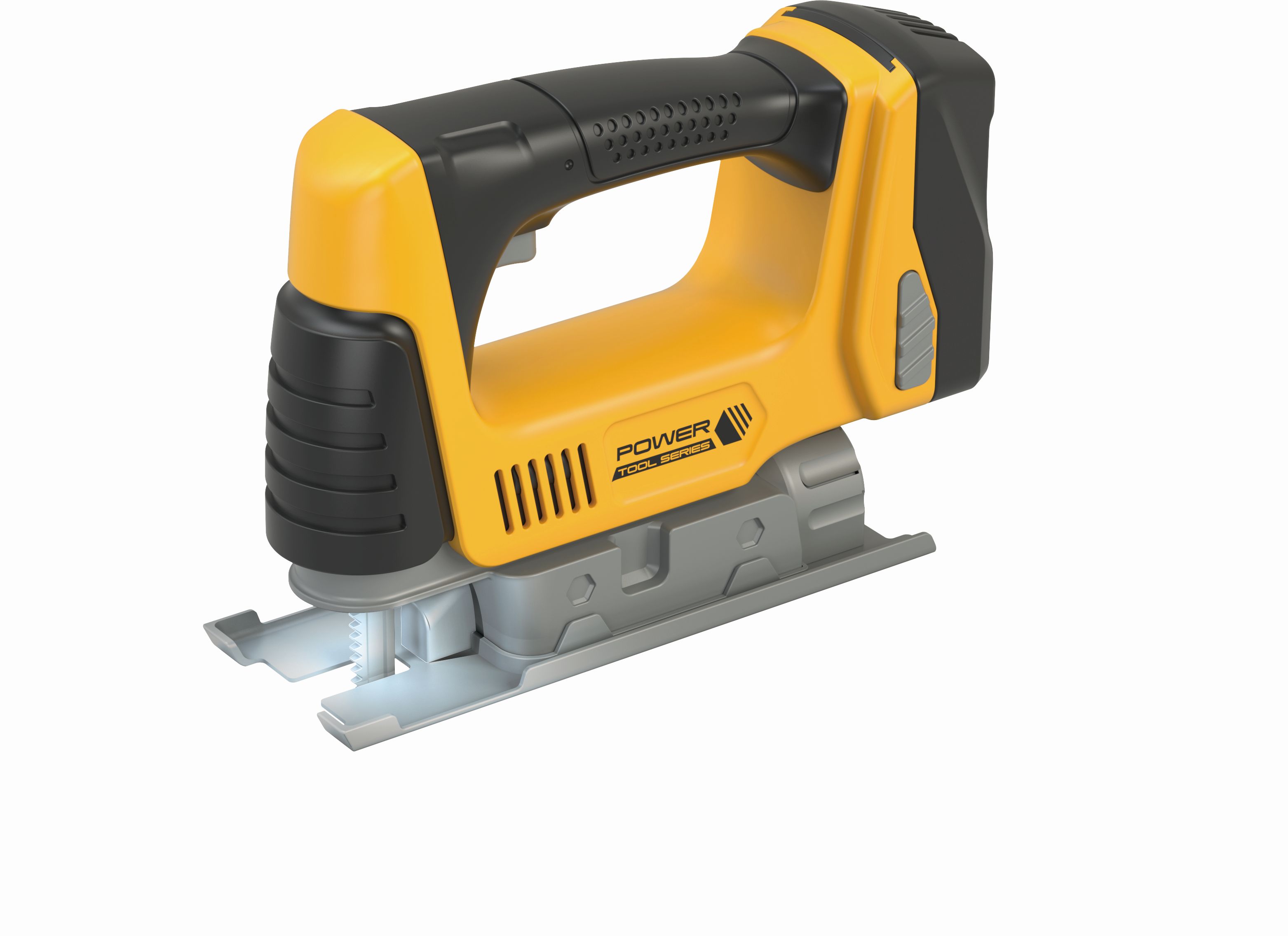 Přímočará pila. Rozměry 19,5×6,5×18 cm. Světelné efekty. 3xAAA baterie součástí. Odpojitelný bateriový modul.